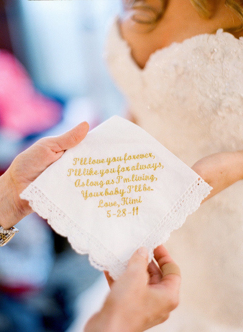 Esta opção é muito utilizada para presentear pais e mães no dia do casamento. Os noivos podem mandar bordar lenços com uma mensagem especial para estas pessoas mais próximas. Geralmente este presente é entregue no dia do casamento.