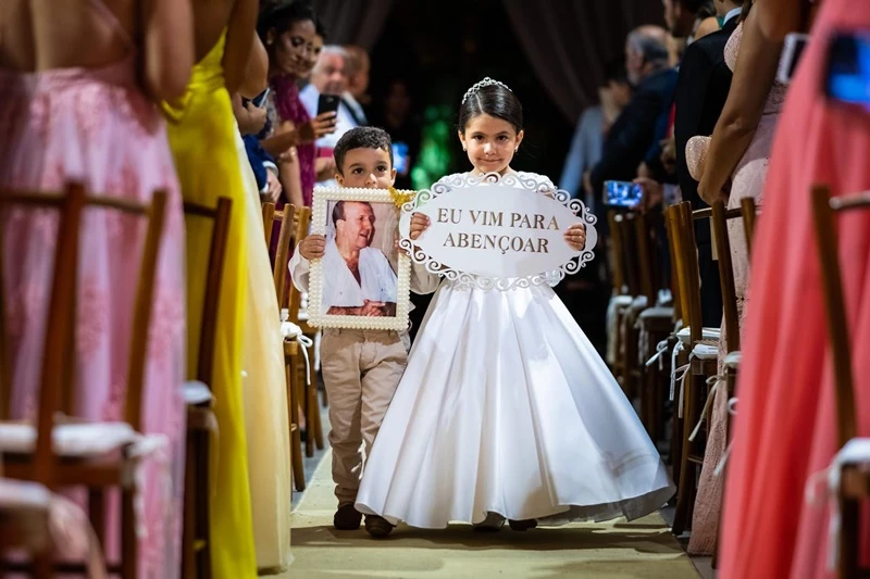 “Normalmente, as pessoas colocam relicário no buquê, mas eu queria fazer algo diferenciado. Foi aí que eu tive a ideia de fazer porta-retratos com a foto do meu sogro e uma plaquinha escrito ‘Vim para abençoar’ para que os sobrinhos do meu marido entrassem com ela”, conta Hellen.