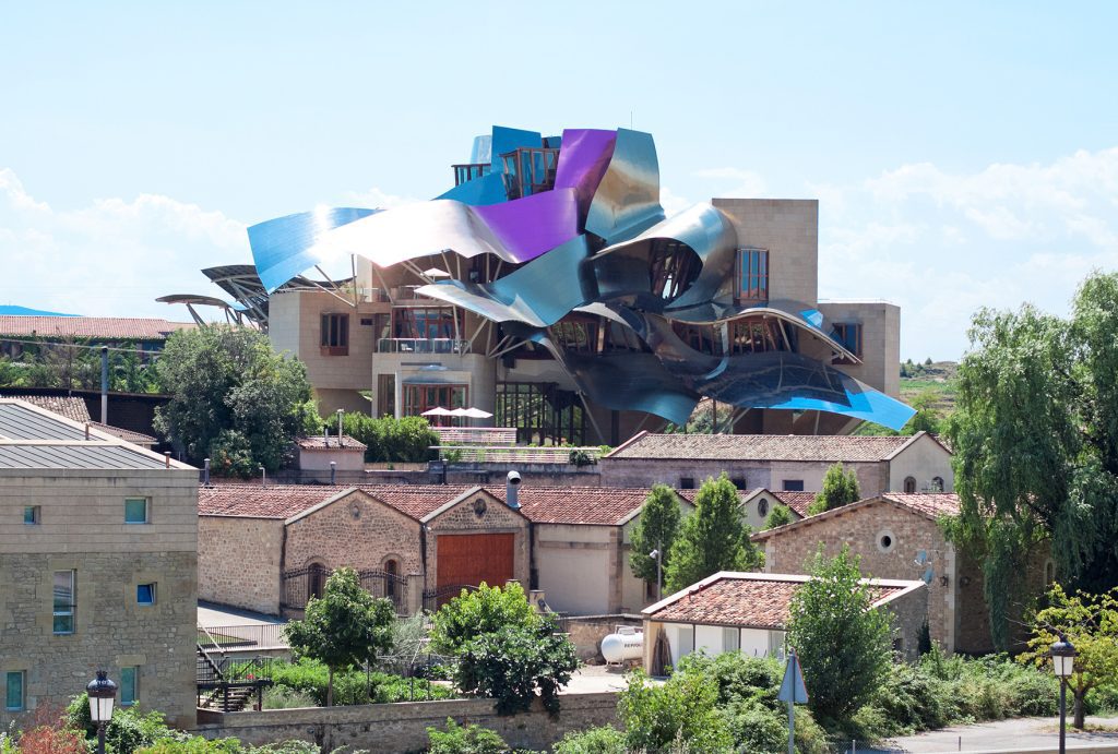 O complexo, que inclui salas de degustação e adegas antigas, tem como grande estrela o hotel Marqués de Riscal, projetado por Frank O. Gehry nos moldes do Guggenheim Bilbao – as placas de titânio em dourado e rosa são uma homenagem aos vinhos fabricados ali.