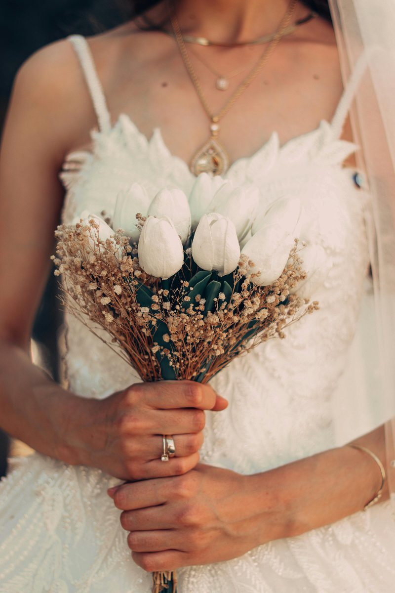 O mais importante é que o buquê de tulipas reflita a personalidade da noiva. Em paralelo, é interessante que ele funcione como uma extensão do vestido e harmonize com o estilo proposto na cerimônia.