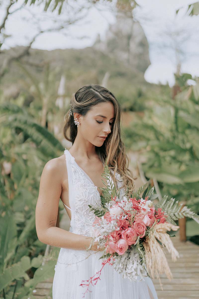 O modelo combinou perfeitamente com o mood praiano do casamento que foi realizado em Fernando de Noronha. Carla escolheu um corte com decote profundo, fendas frontais e hotpants. Simplesmente maravilhosa!