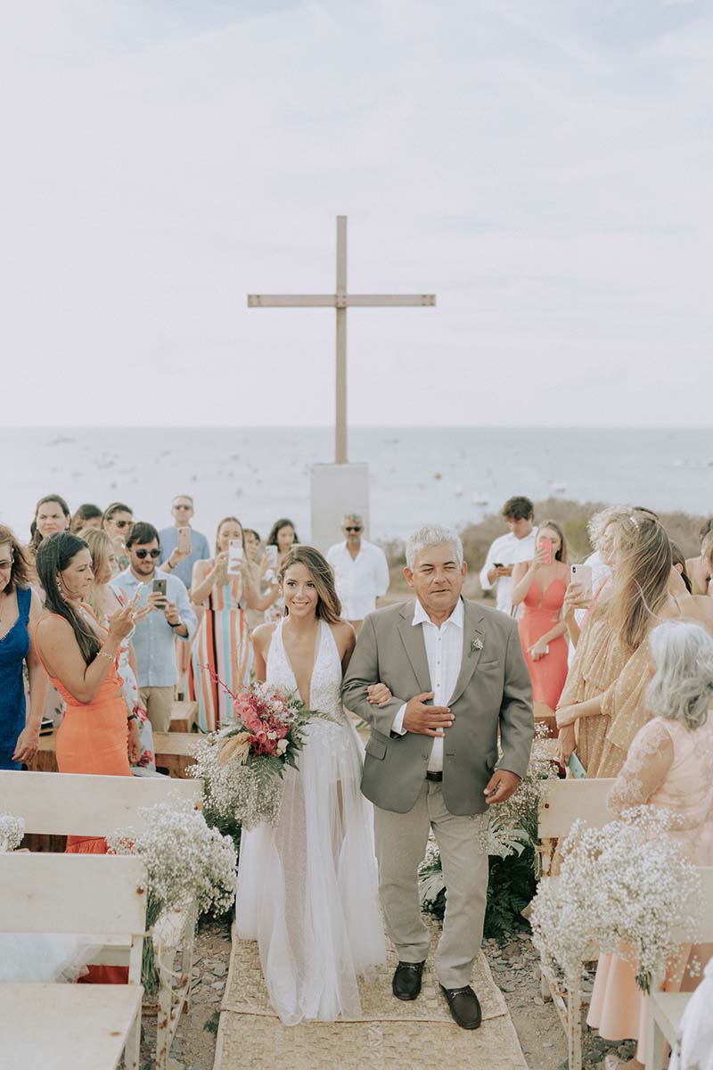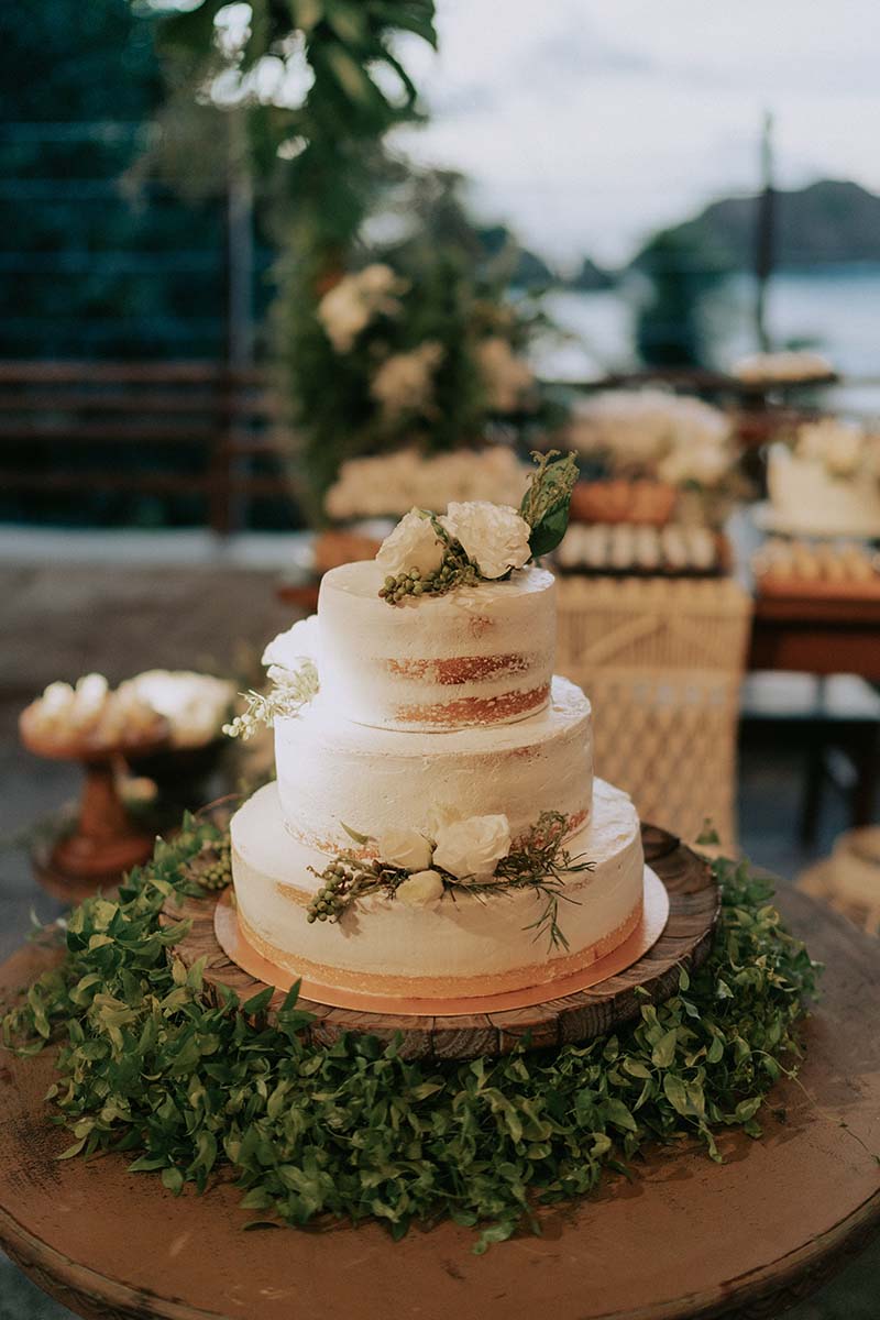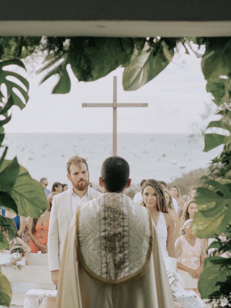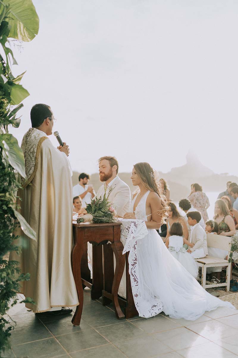 A cerimônia aconteceu em frente à Capela São Pedro dos Pescadores. “Não é que esse sonho se tornou realidade?”, brincou a noiva. A decoração feita com costelas de Adão deu um tom rústico e sofisticado para o casamento.