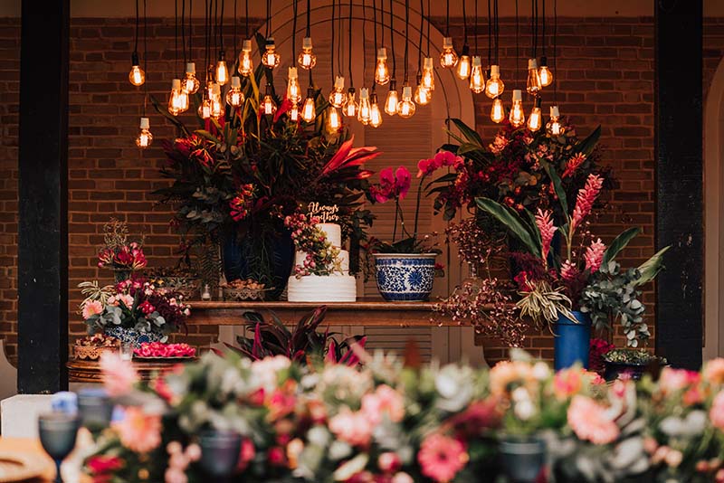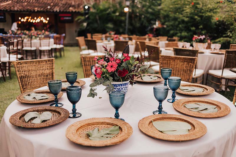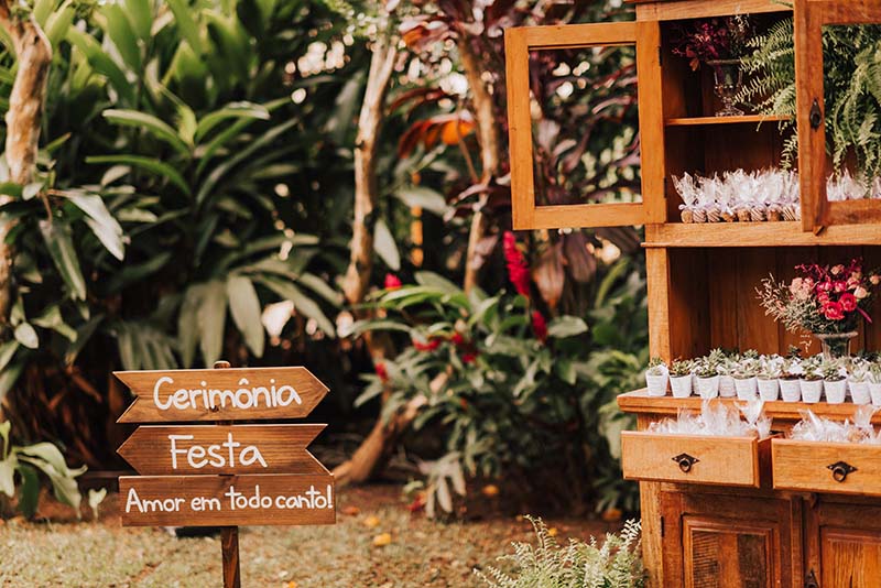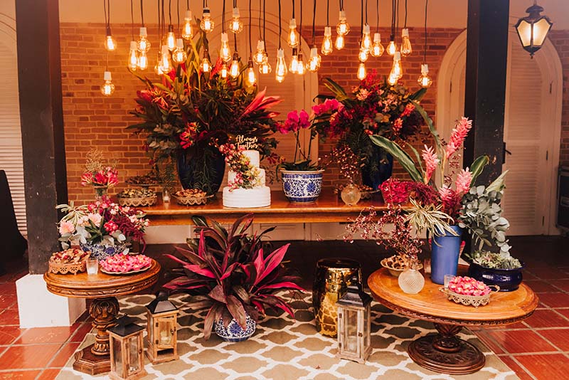 A decoração do casamento foi rústica com toques de delicadeza nas cores e nos detalhes. Costelas-de-Adão foram usadas para decorar as mesas, flores com cores vibrantes fizeram parte dos arranjos em perfeita harmonia com as folhagens verdes. Na mesa do bolo lâmpadas de filamento deixaram o ambiente bem aconchegante.