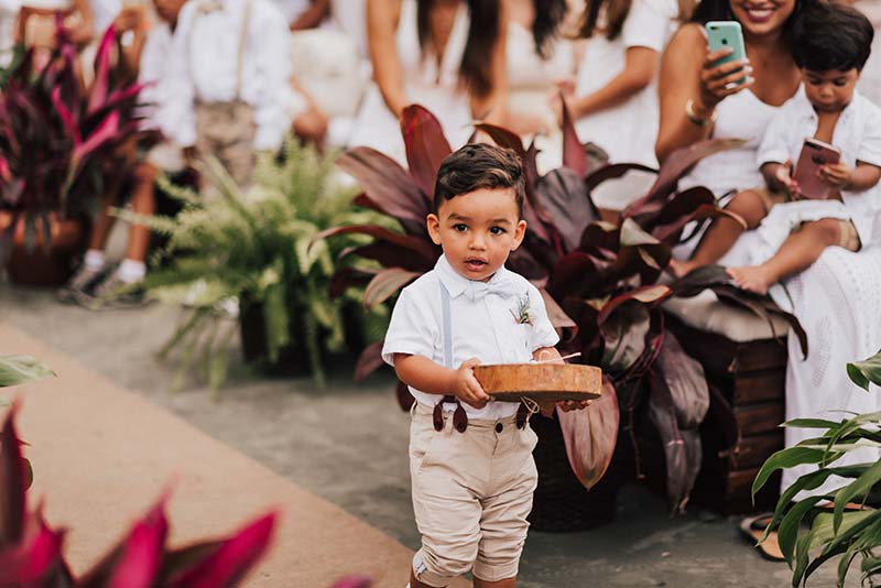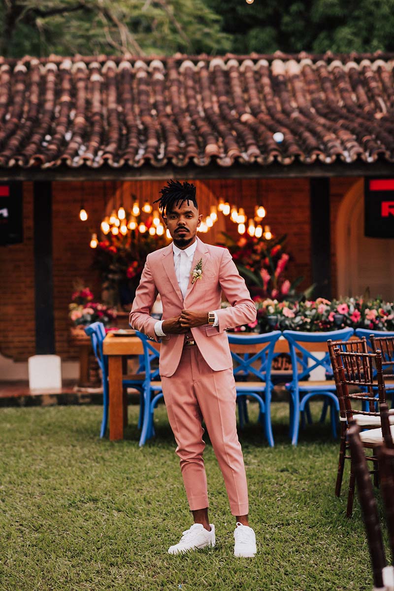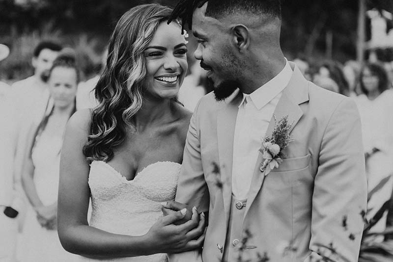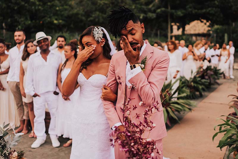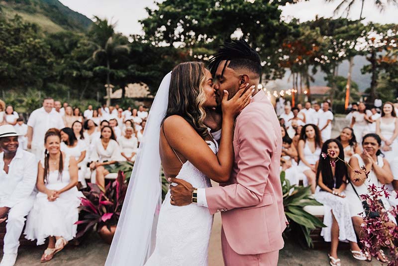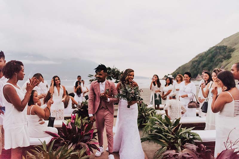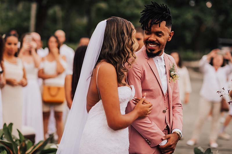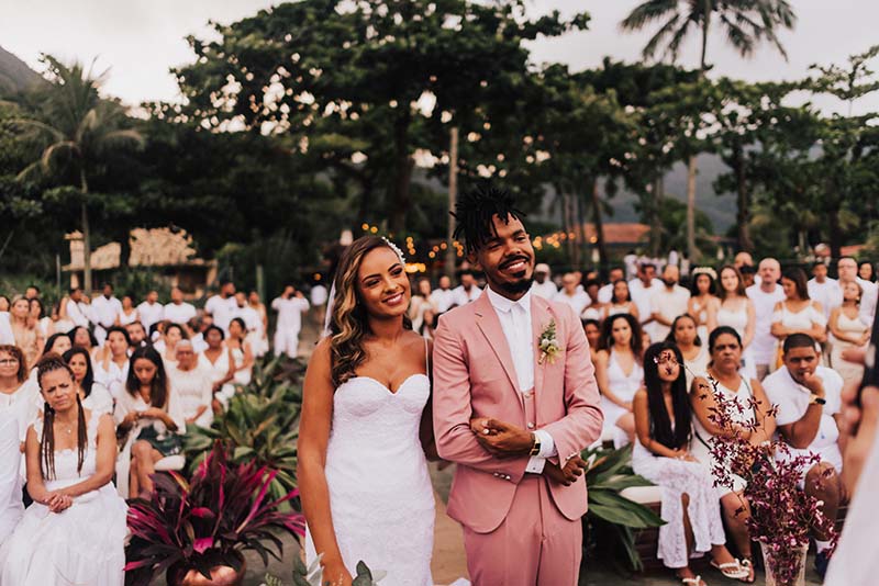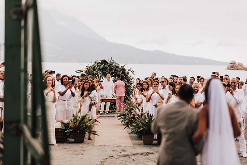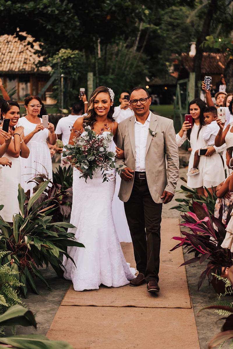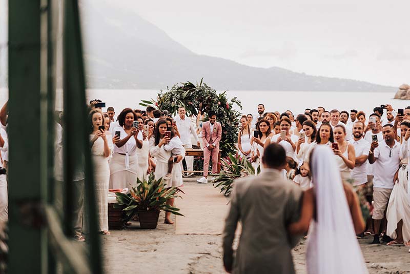 “Eu me casaria de vestido com corte sereia mais mil vezes”. O modelo escolhido por Evelyn tem decote nas costas, alcinhas e decote coração. O corte perfeito para o mood praia do casamento. Além da noiva, todos os convidados usaram branco. Os únicos diferentes eram o noivo de rosa e as madrinhas de azul claro. Diferente e inspirador!
