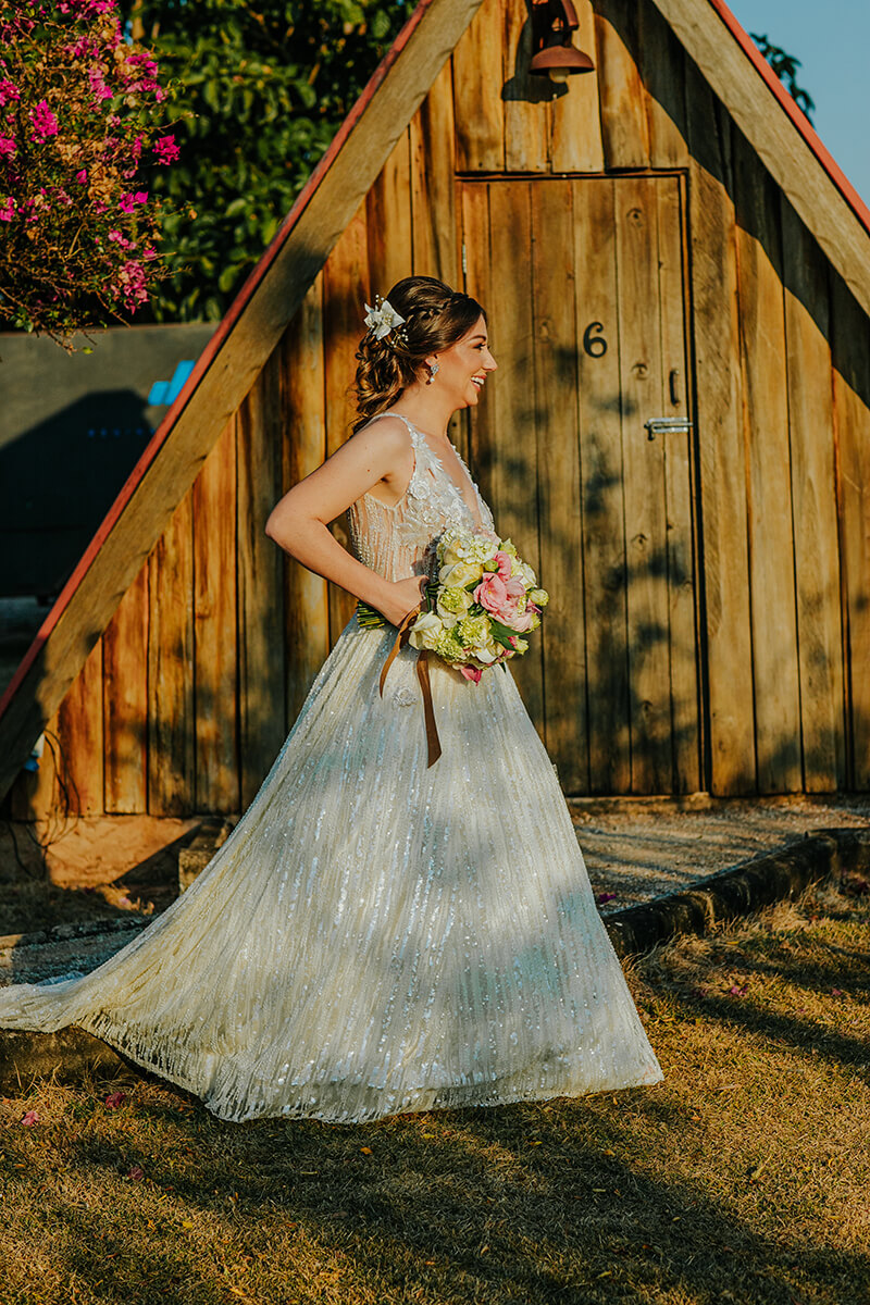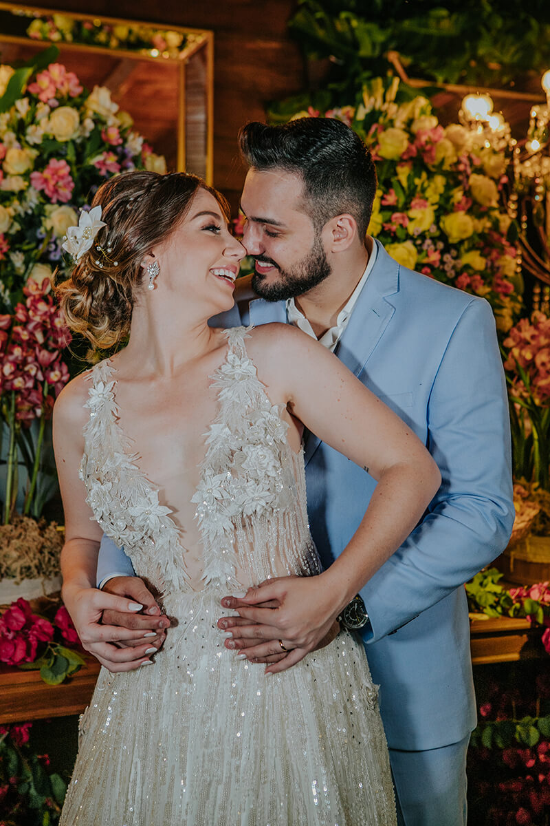 Durante a pandemia, Rayanna e Manoel precisaram adiar a cerimônia e adaptar vários detalhes. Um deles foi o vestido de noiva. “Eu sonhava com um modelo de um atelier de Santa Catarina, mas como não encontrei o tamanho certo, recorri a uma costureira da minha cidade. Ela fez um vestido maravilhoso, exatamente como eu queria”, conta a noiva.