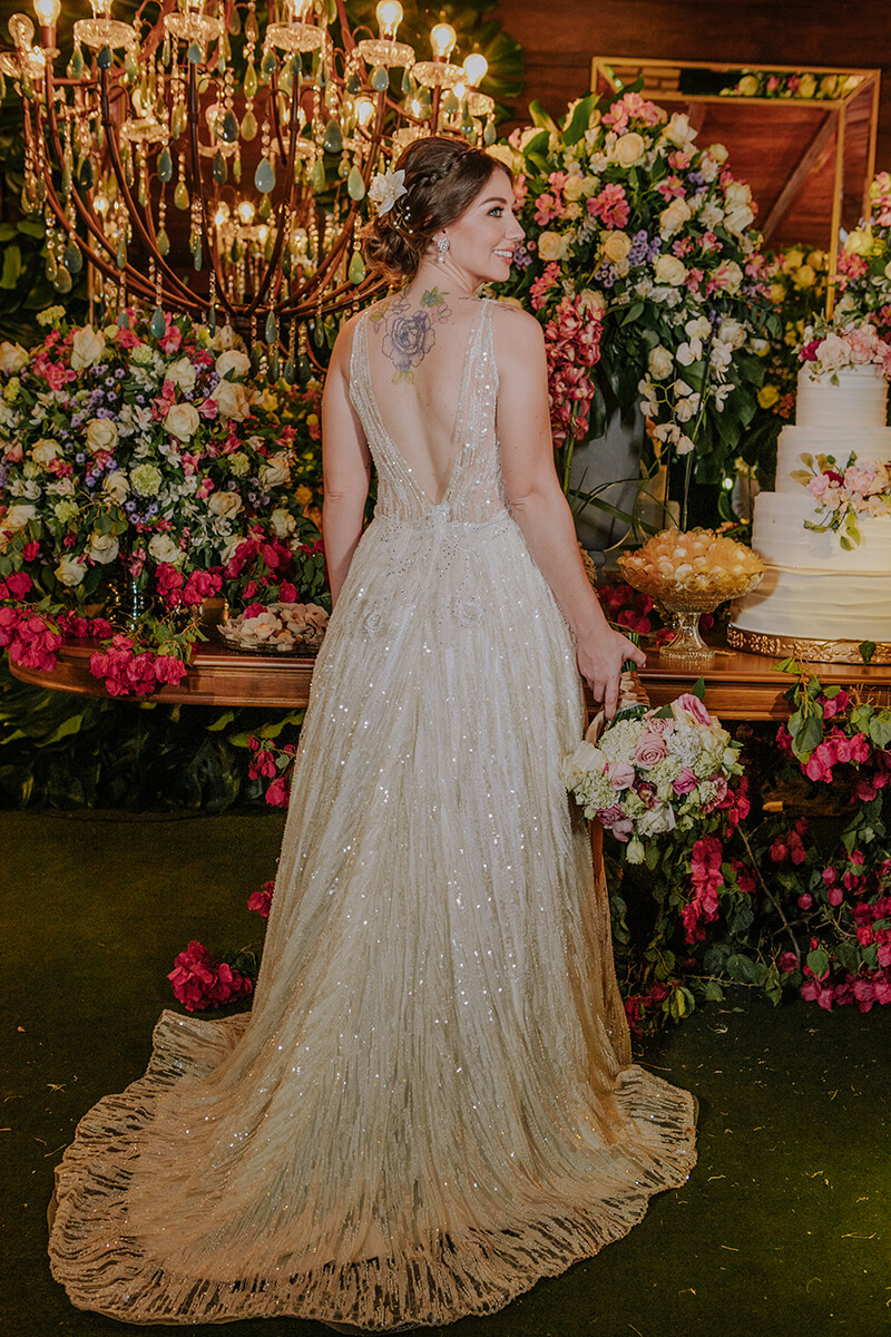 O resultado foi um modelo fluido e delicado, com detalhes rendados que refletiam toda a leveza da cerimônia. “Recebi muitos elogios e me senti linda. Dormi e acordei com o vestido”, diz Rayanna, entre risos.