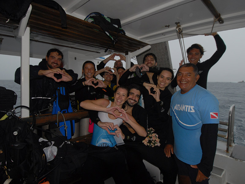 A Flávia não conseguiu pensar em nada na hora. Só tirou o regulador dela, o dele e o abraçou forte. Ela nos contou que sentiu uma felicidade enorme, algo que nunca tinha vivido anteriormente. Para completar a experiência única, Philippe levou o anel para debaixo d’água e o colocou no dedo da sua noiva.
