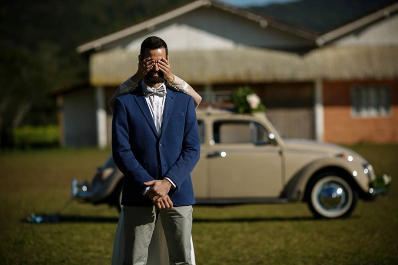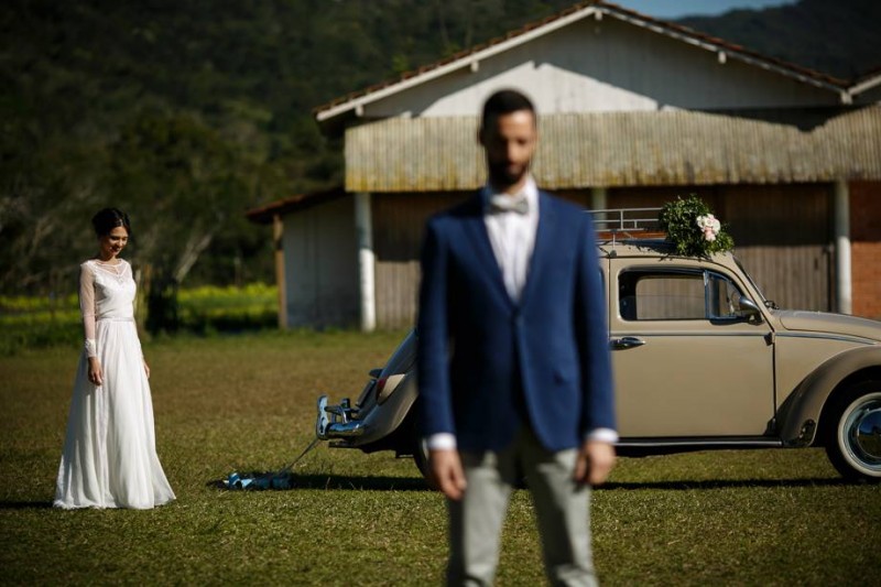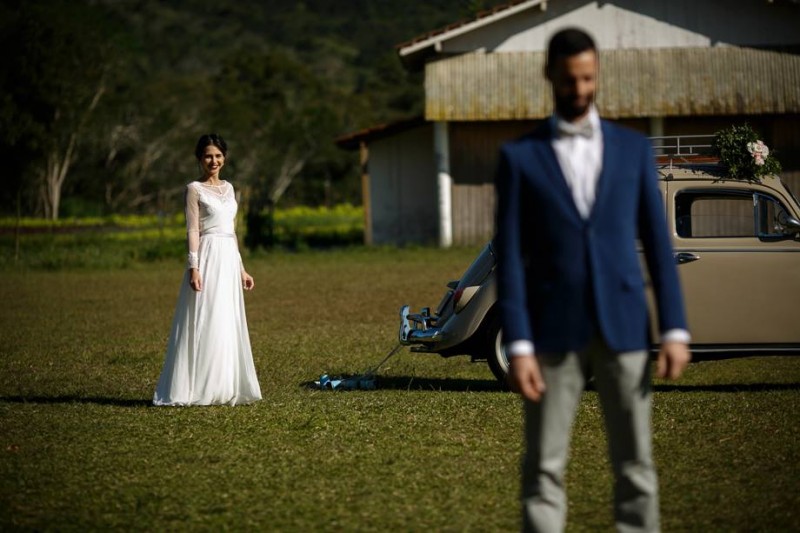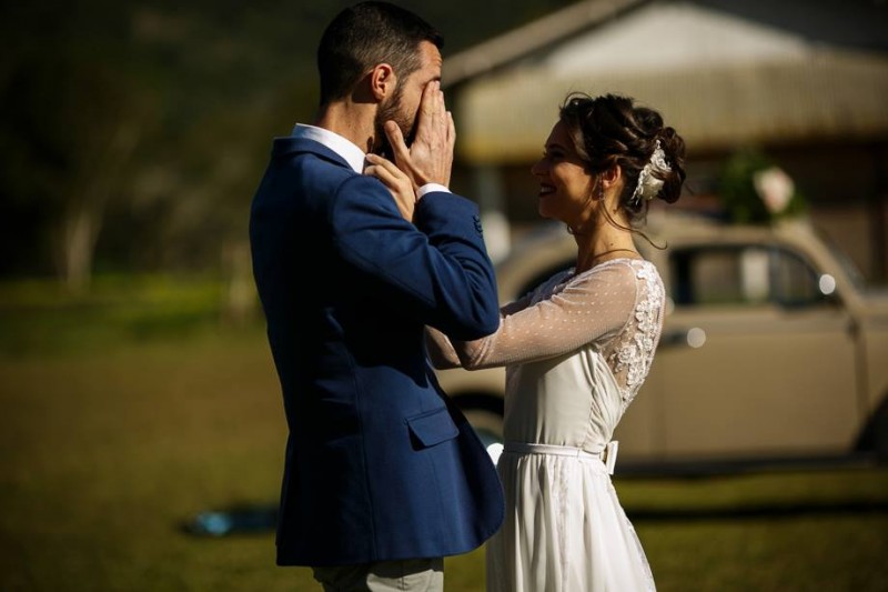 Para se arrumar para o grande dia, o casal alugou uma casa, na Praia da Daniela, em Florianópolis. Lá, os dois puderam se arrumar juntos – mas o Thiago só viu a Melina pronta, alguns minutos antes da cerimônia, pois eles decidiram fazer o first look – ao invés do noivo só ver a noiva na cerimônia, eles reservaram um momento antes de tudo acontecer para que pudessem se ver. E a Melina recomenda a experiência: “Foi tão gostoso! A gente pôde curtir juntos esse primeiro contato! Foi emocionante. O Thi ficou super emocionado. Eu tinha acabado de pedir pra cerimonialista entregar um lencinho para ele que tinha dois passarinhos bordados e um textinho na caixa bem legal. E depois nos encontramos – o dia estava tão lindo, tudo tão perfeito, estávamos tão felizes”.