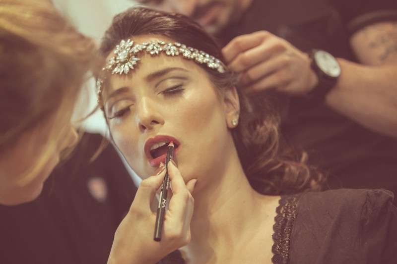 Noiva Isabella sendo maquiada por Marcela Queiroz – Foto: Douglas Melo Foto e Vídeo