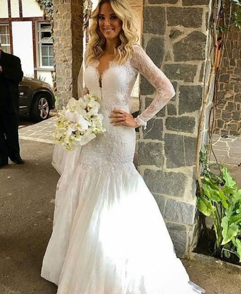 Ticiane Pinheiro escolheu um visual clássico e romântico. Usou os cabelos soltos e um vestido modelo sereia assinado pela estilista Lethicia Bronstein. As rendas delicadas nas mangas longas e no decote das costas deram um toque atemporal ao look, digno de inspirações de vestido de noiva.