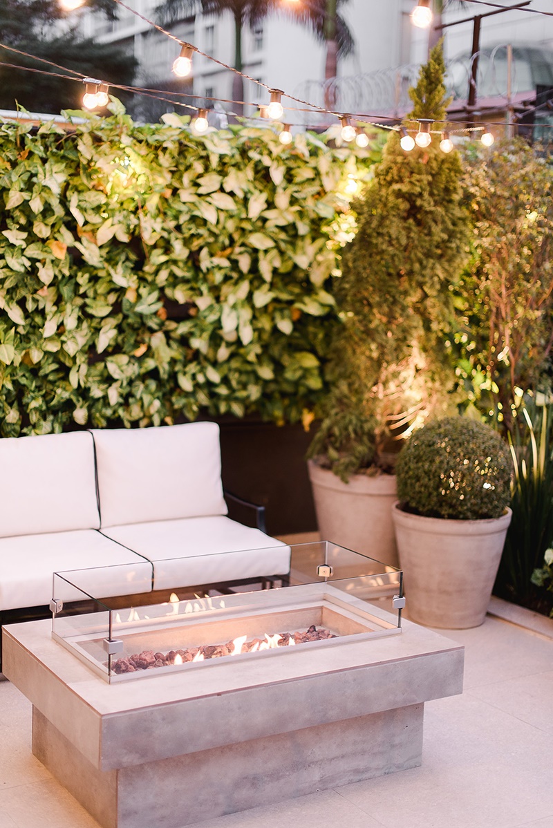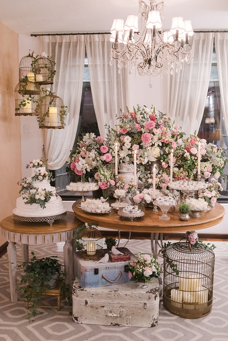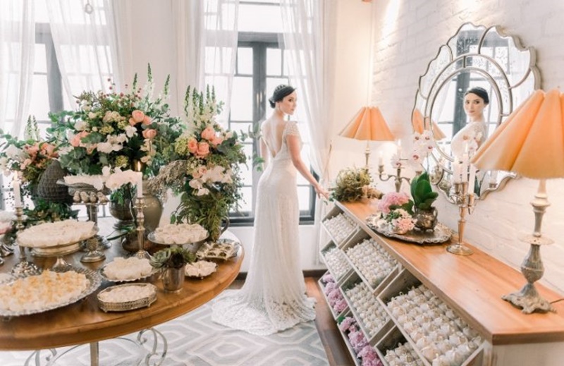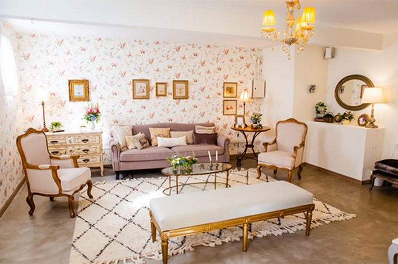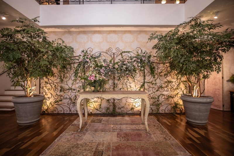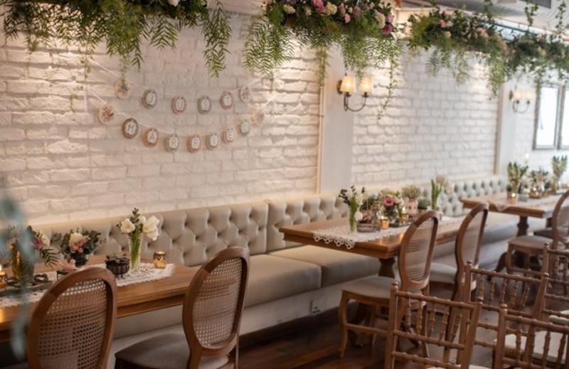 Além da fachada com ares românticos, ao entrar no local, os noivos e convidados já são surpreendidos por um lounge com varal de luzinhas, que traz referências aos pátios franceses.