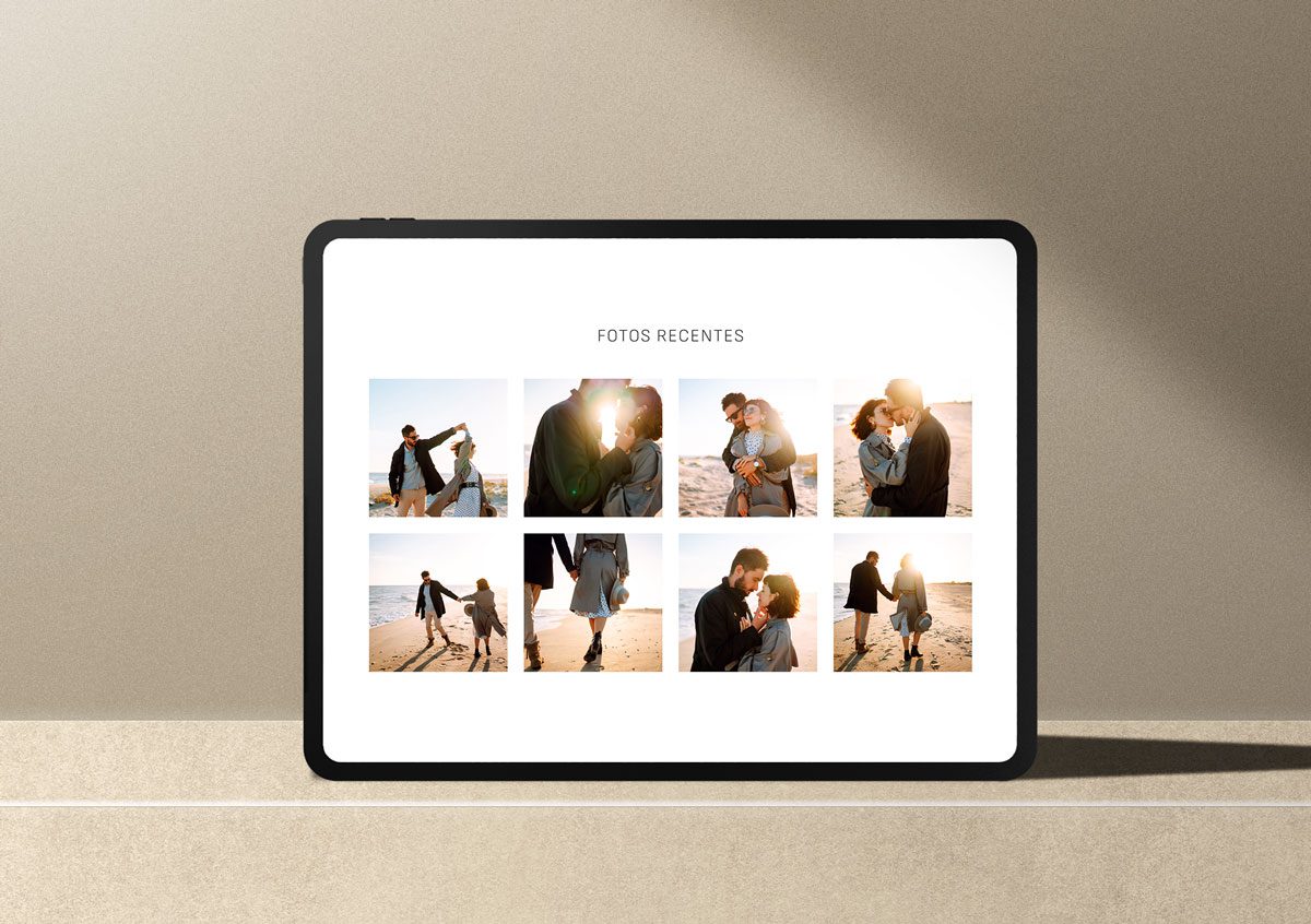 Uma opção é usar as fotos do pré-wedding no álbum e surpreender os convidados com as imagens inéditas. Além disso, você pode editá-las para deixar o seu álbum do jeito que mais combina com o site de vocês!