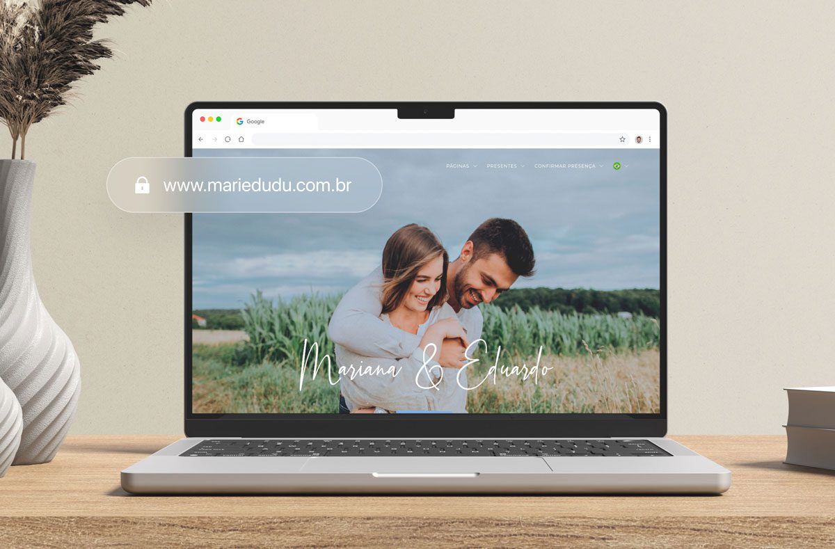 Ao criar um site de casamento, os noivos integram convite, confirmação de presença, lista de presentes e detalhes da cerimônia. Assim, o convidado recebe o convite e é direcionado para uma página completa e personalizada.