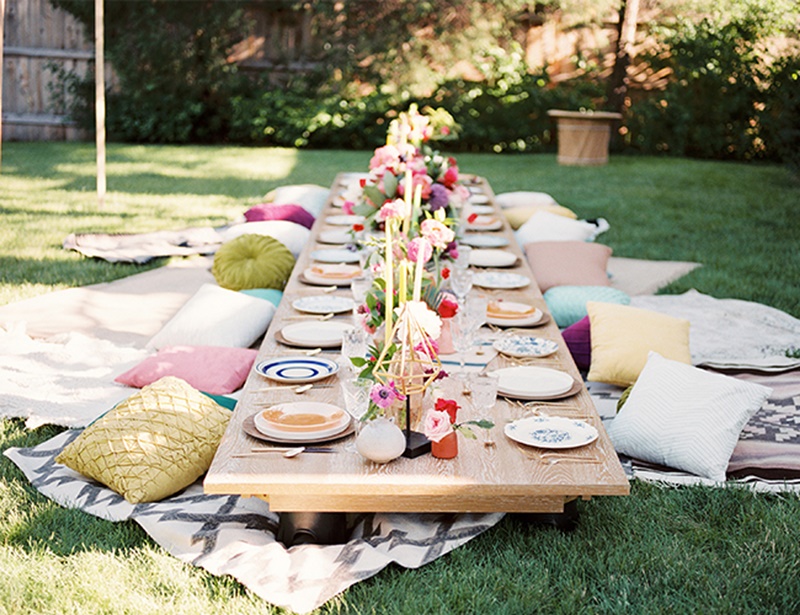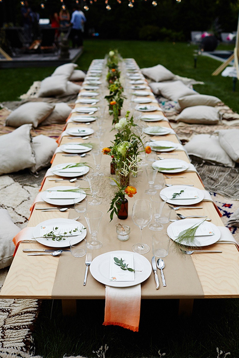 As mesas baixas na decoração de casamento são as preferidas das festas boho e ao ar livre. “Elas podem ser usadas em casamentos com uma proposta mais descontraída (praia, chácaras, quintais de casas, até em rooftops),e em casamentos mais intimistas”, comenta Danielle.