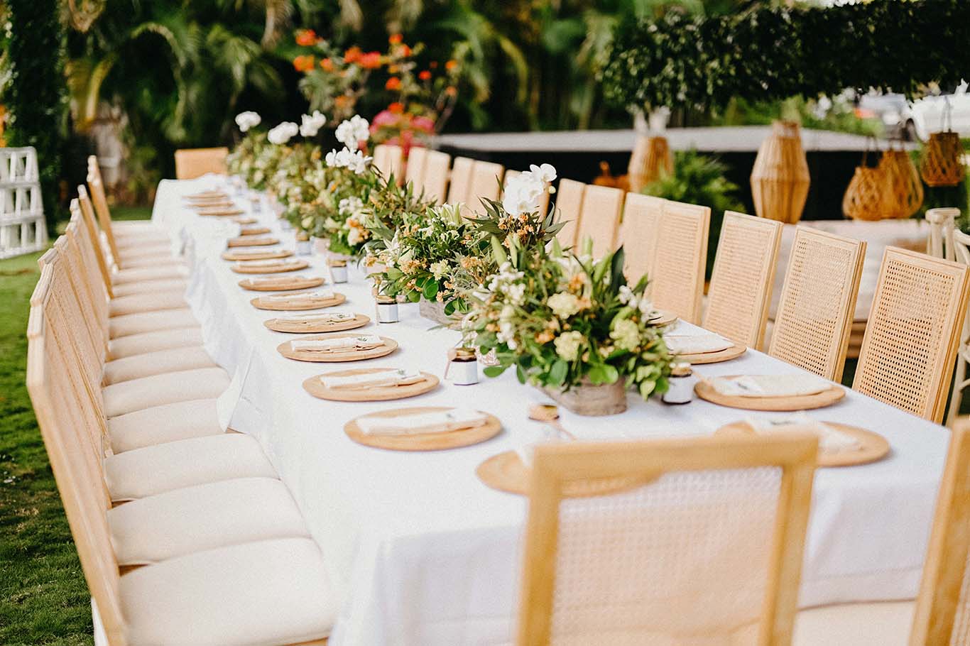 Na hora de escolher o local ideal, é essencial pensar em como ele conversa com o estilo da decoração. Locais com luz natural abundante valorizam tecidos fluidos e arranjos orgânicos, enquanto espaços rústicos ao ar livre permitem integração com a natureza e mobiliário de madeira ou vime, criando ambientes acolhedores e autênticos.