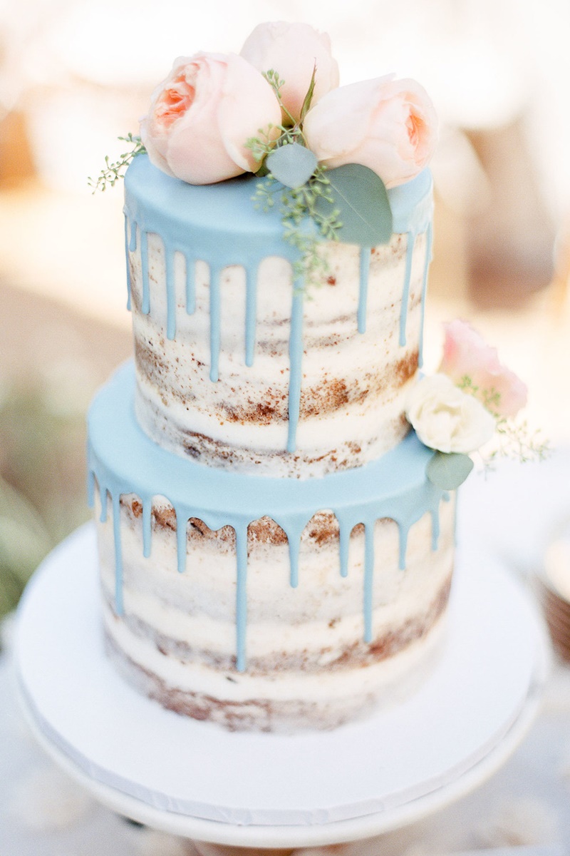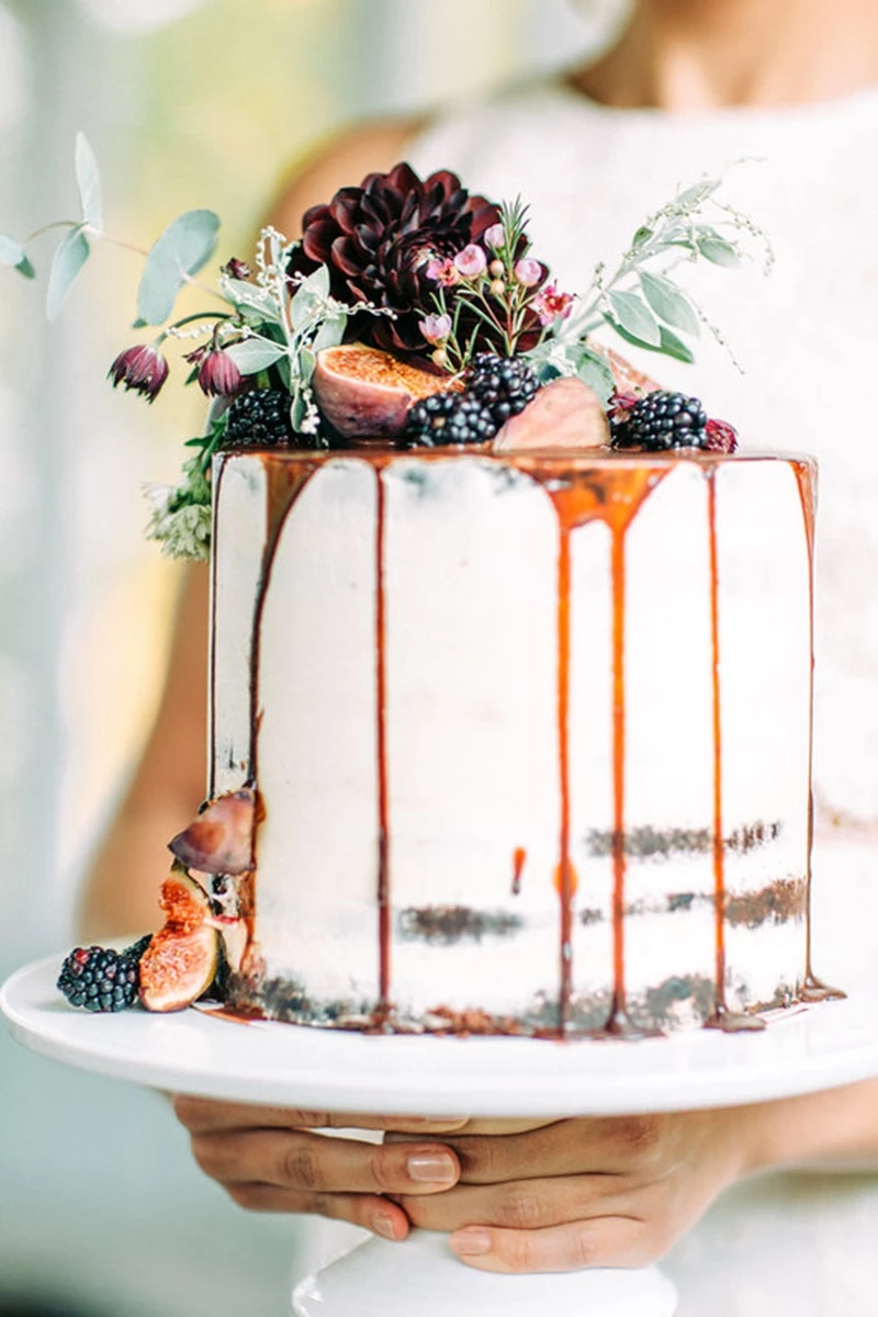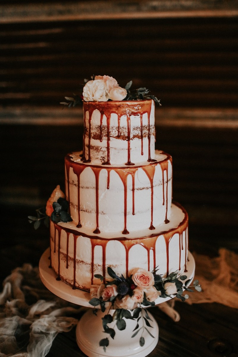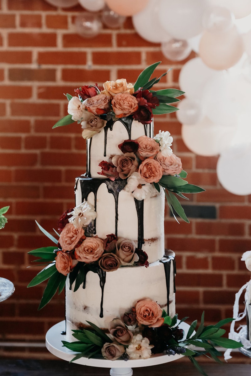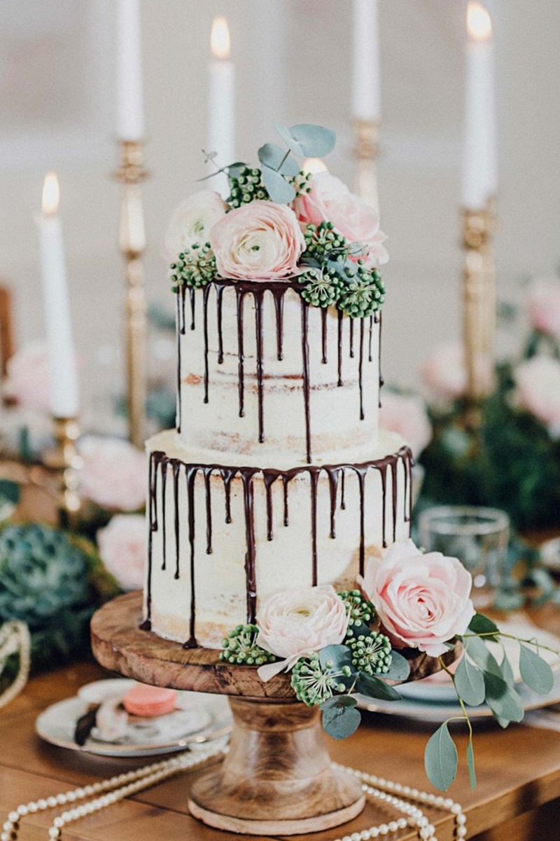O drip cake já era bastante popular em aniversários, chás de bebes e festas de noivado. Por isso, é responsabilidade da decoração transformá-lo em um bolo de casamento.