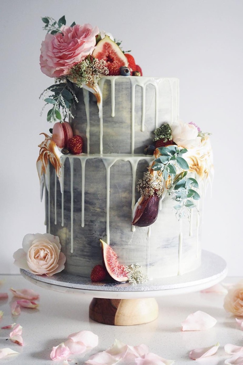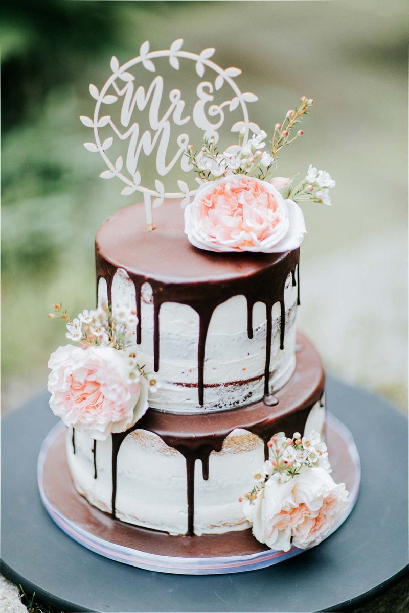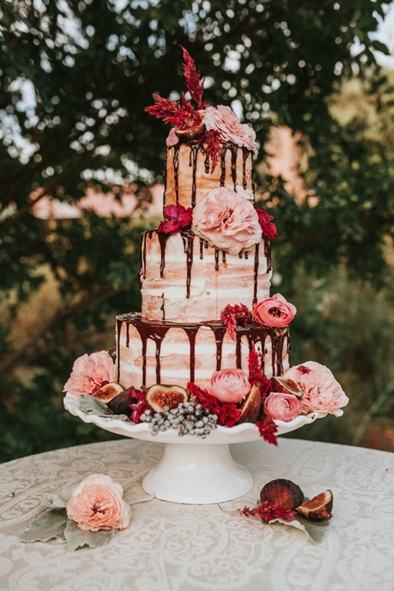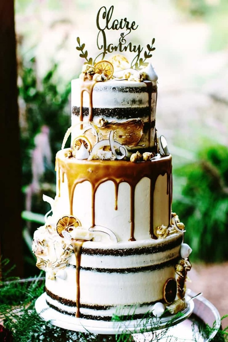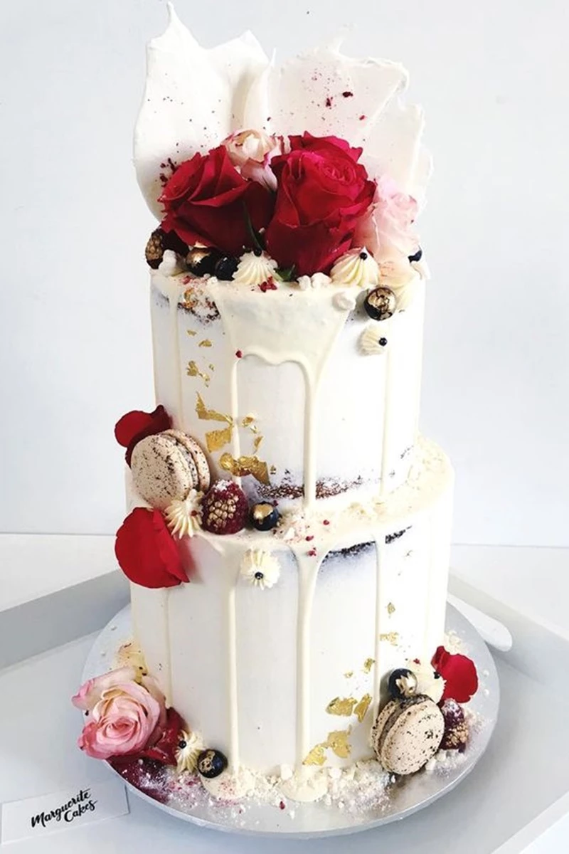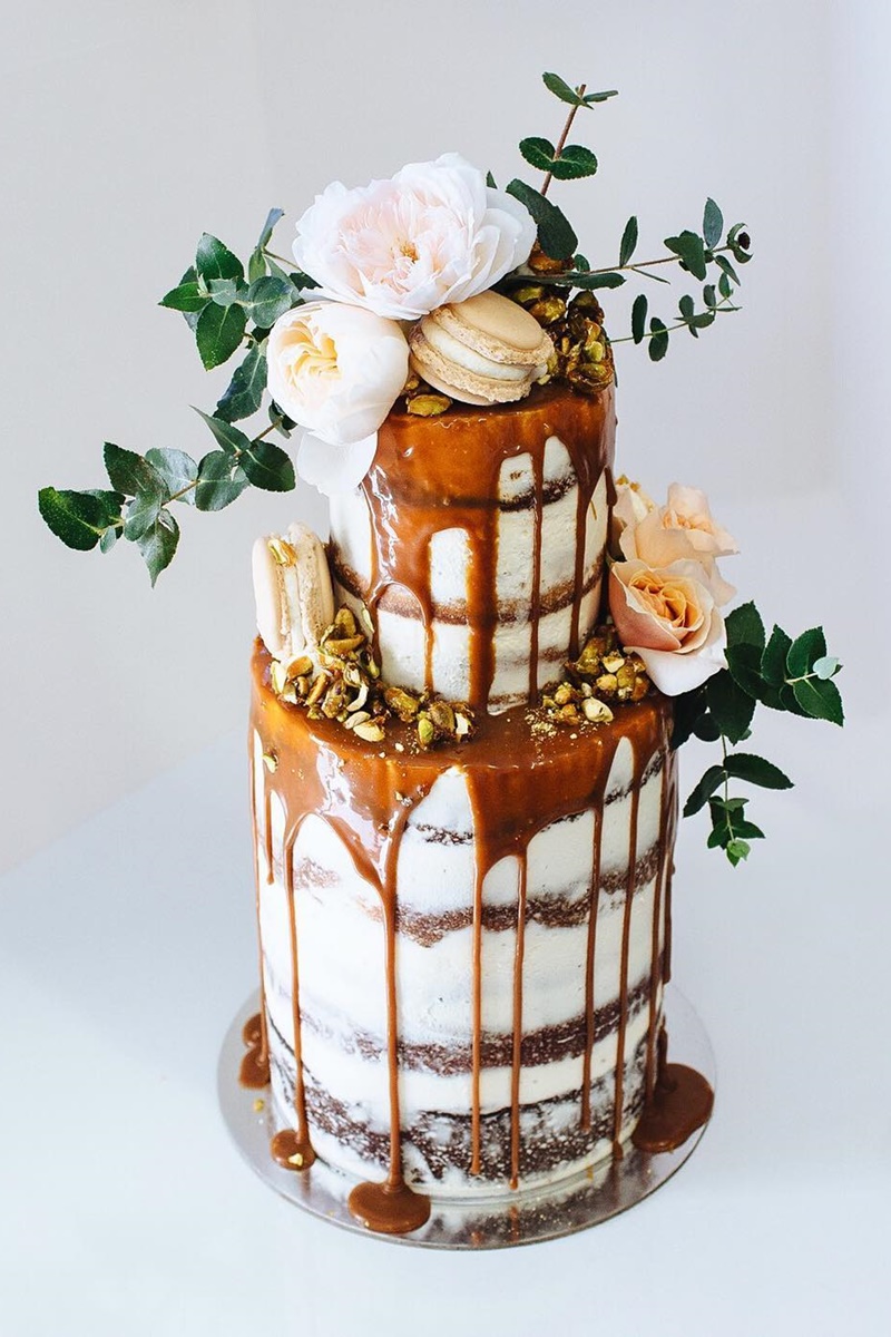 O drip cake já era bastante popular em aniversários, chás de bebes e festas de noivado. Por isso, é responsabilidade da decoração transformá-lo em um bolo de casamento.