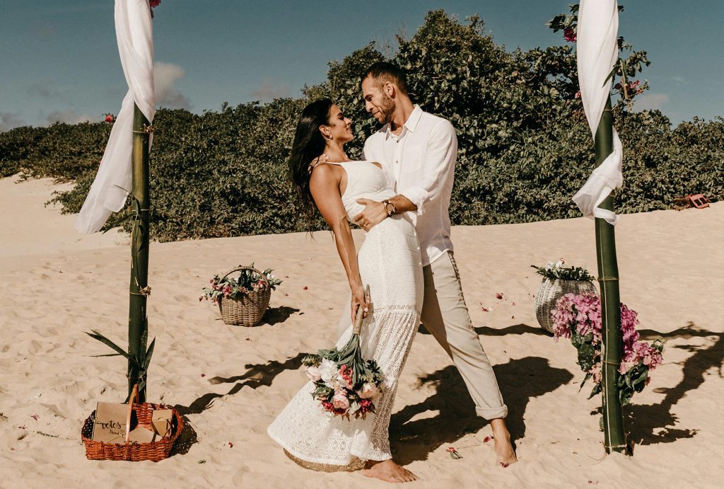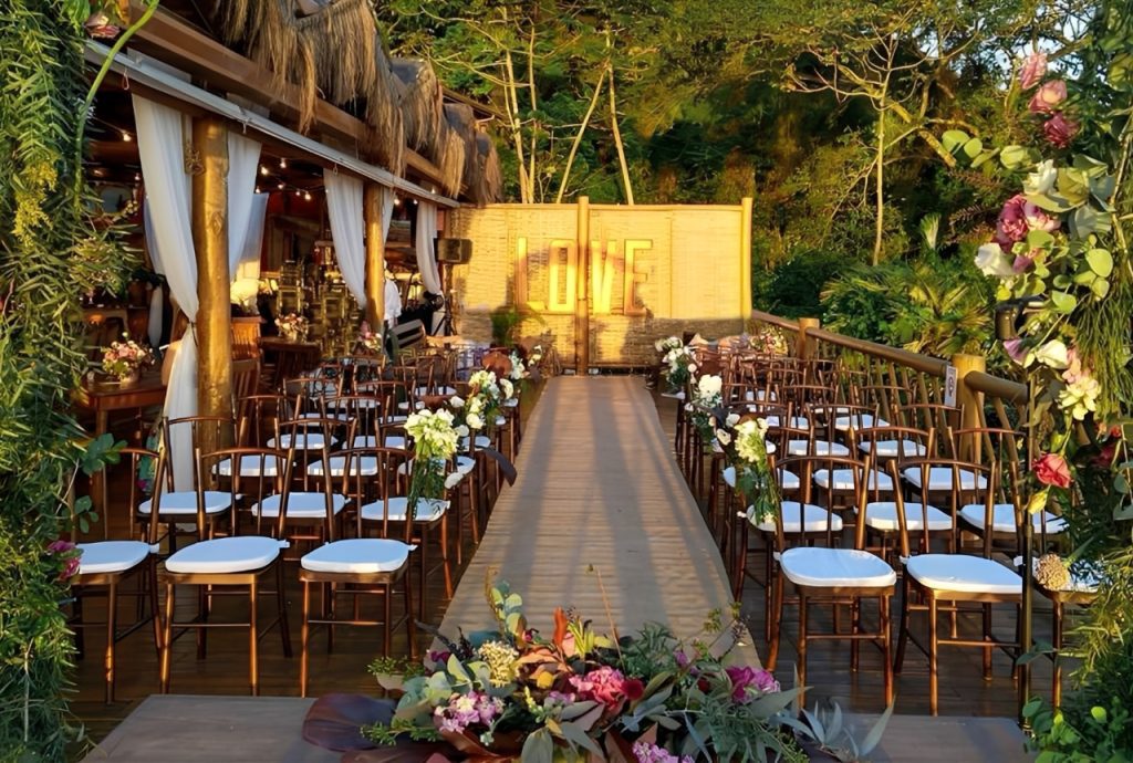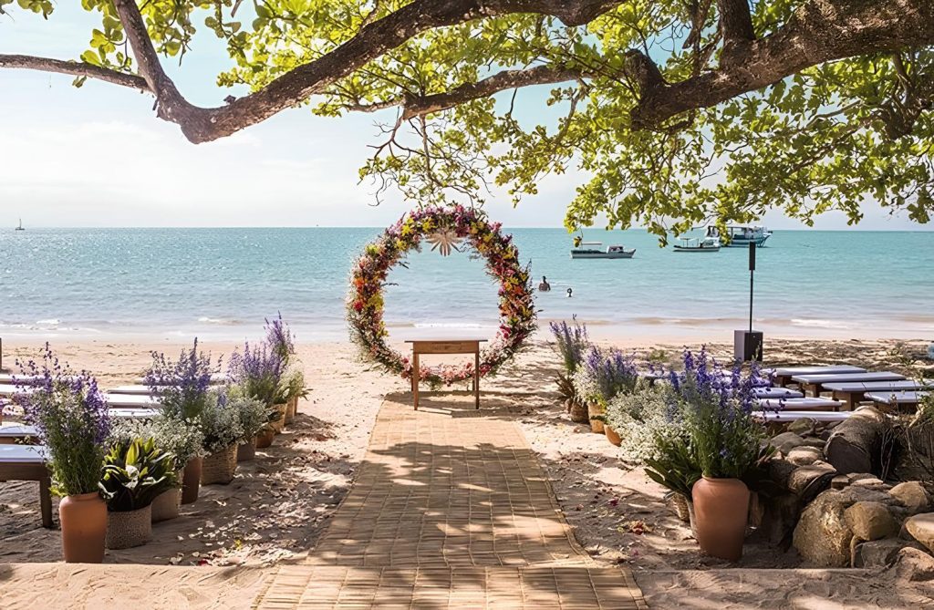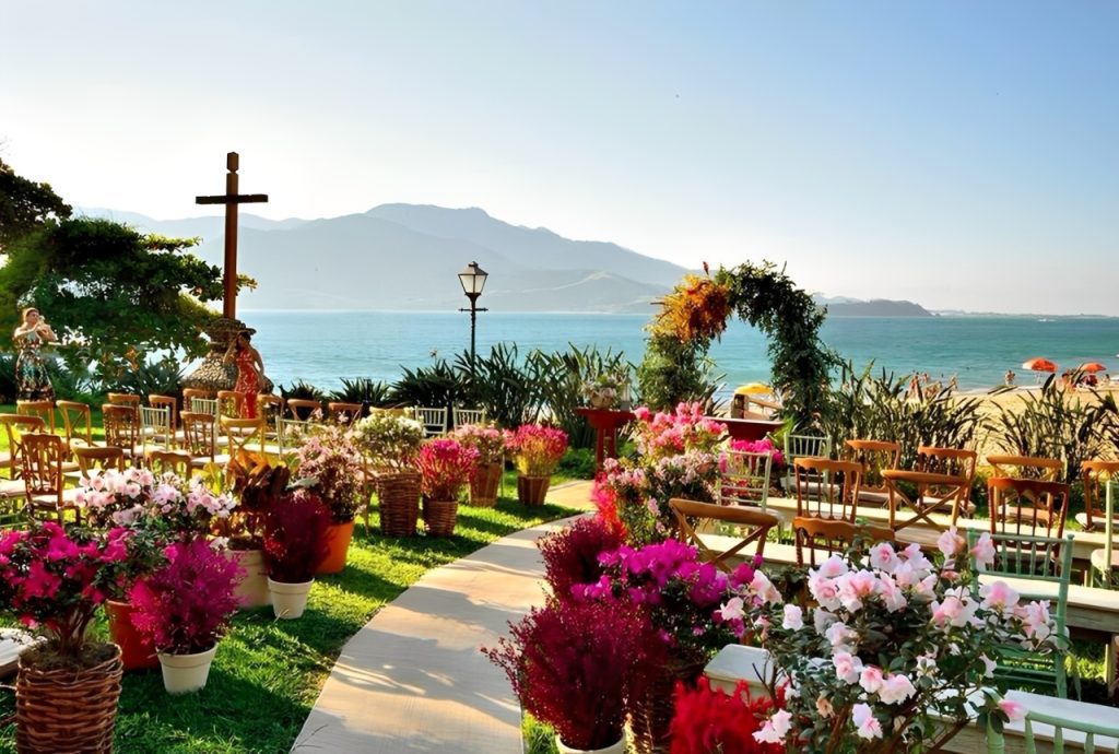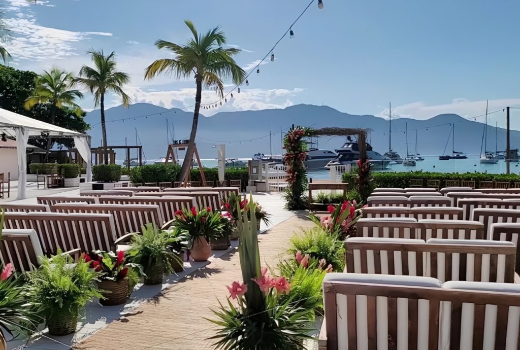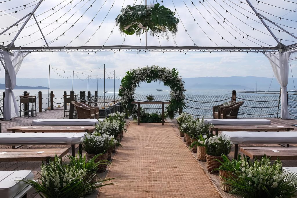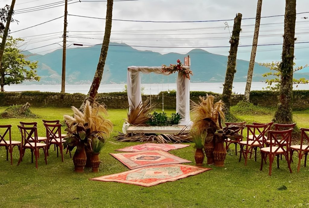 Tem como diferencial ser o único local para casamento que não é “pé na areia”, explica Erica Oliveira, uma das responsáveis pelo local. As cerimônias são realizadas em uma área externa com vista para o mar e a montanha.