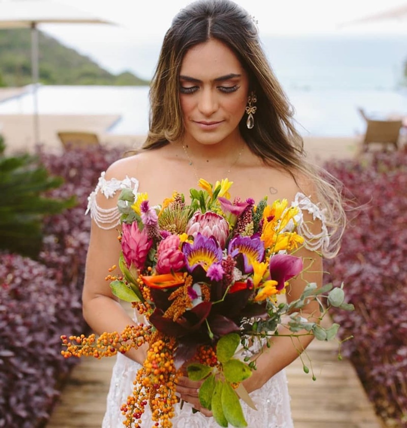 Vanessa indica usá-la sozinha apenas com algumas folhagens, ou composta com flores mais exóticas e de estilo tropical. Caso a noiva seja mais clássica, Harumi recomenda fazer a composição com flores nobres mais delicadas.