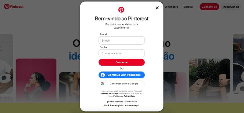 O primeiro passo é acessar o endereço na internet www.pinterest.com e criar o seu perfil. Na página inicial você pode escolher entre criar uma conta do zero ou logar usando o perfil que você já tem no Facebook. Para usar o perfil do Facebook, basta clicar no ícone da rede e colocar seu login e senha de acesso.
