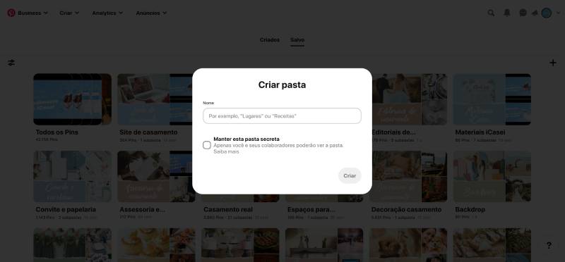 No canto superior direito que aparece na sua tela, clique no seu nome e, automaticamente, você será redirecionado para os painéis. Eles podem ser públicos, vistos por todo mundo, ou privados. Para manter tudo guardado, lembre-se de clicar no botão “secreta”, que aparece logo abaixo do campo aonde você digitará o nome da pasta. É interessante manter uma para cada tema da sua preferência, se modo que seja fácil acessar as inspirações.