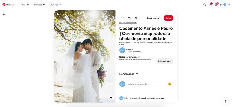 Descubra como o Pinterest pode ser uma ferramenta incrível para inspirar o seu casamento dos sonhos. Ao começar a planejar o grande dia, é natural se envolver com ideias e inspirações, e o Pinterest pode ser um grande aliado nesse processo. Explore diferentes temas, decorações, vestidos e detalhes para encontrar o estilo perfeito para o seu casamento. Com milhares de imagens e ideias disponíveis, o Pinterest oferece uma fonte inesgotável de inspiração para tornar o seu casamento único e especial. Aproveite essa plataforma para criar um quadro de inspirações personalizado e transformar seus sonhos em realidade.