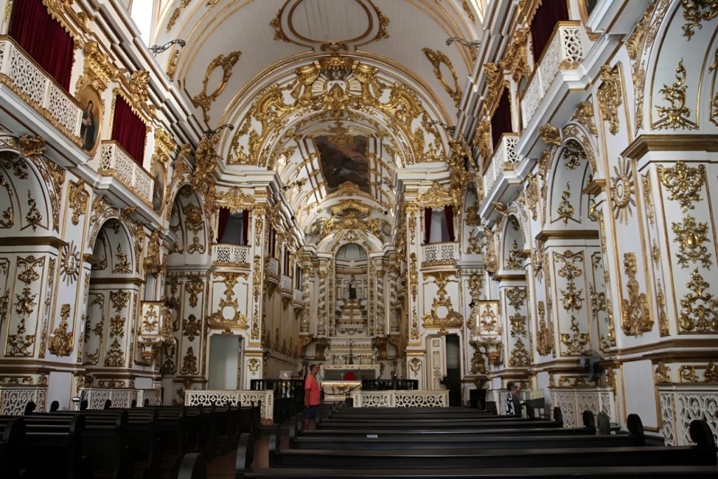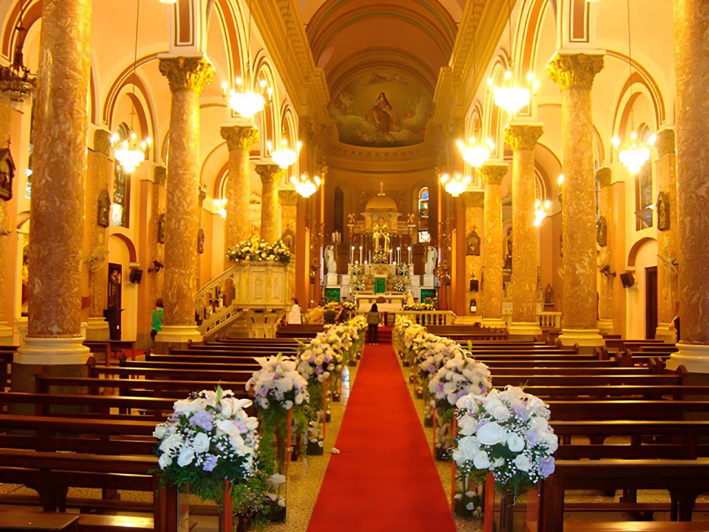 Um templo neo-barroco com entalhes em madeira e iluminação marcante no momento de entrada da noiva — ótimo para fotos emocionantes. Espaçosa, favorece circulação e captura de diferentes ângulos pelos fotógrafos.
