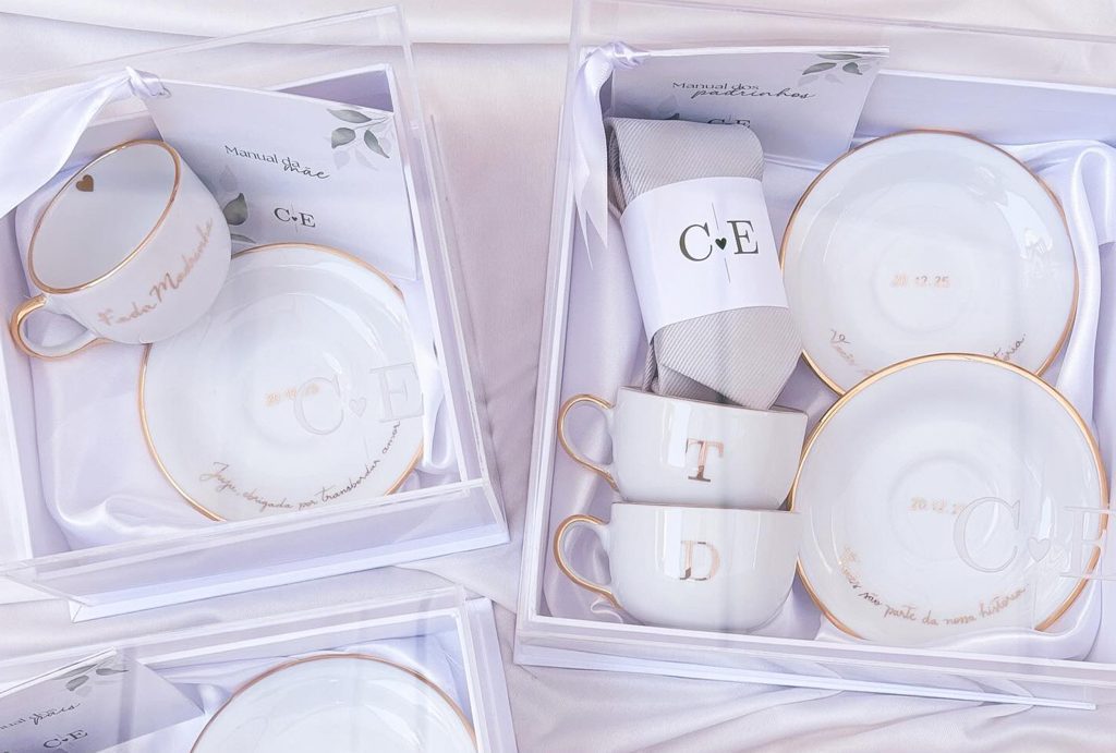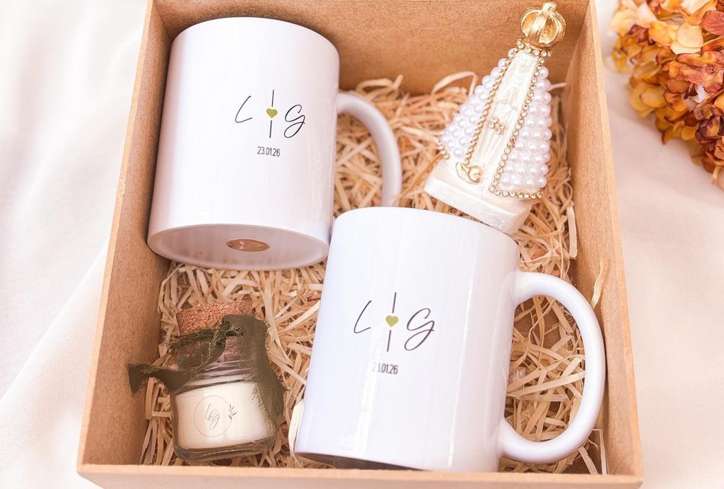 Joias, semijoias, porta-brincos, kits de beleza, ecobags, copos e canecas personalizadas e kits combinando são as opções mais escolhidas. Além disso, essas lembranças reforçam a memória afetiva do Grande Dia.