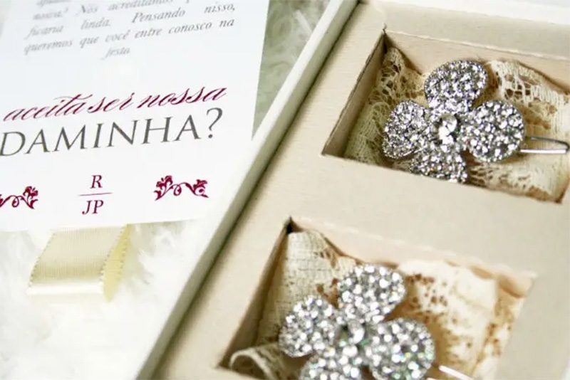 Outra boa ideia para presentear daminhas e pajens é dar a eles os acessórios que eles usarão no Grande Dia. A designer Maria Ignez Simões criou, em parceria com a designer Dani Dalledone, uma caixinha para presentear as meninas com acessórios para o casamento. Para os meninos, é possível apostar em uma caixinha com uma gravatinha para a cerimônia.