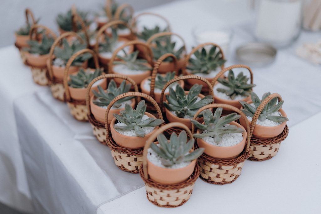 Uma opção super charmosa é oferecer suculentas como lembrancinhas de casamento. “As plantas e sementes têm um apelo emocional. É preciso plantar, regar, cuidar, que é o mote principal de qualquer relação”, aponta Roberta. E mais: o mimo pode levar uma embalagem sustentável. “Os noivos podem utilizar uma caixinha de madeira reaproveitável ou até escolher uma embalagem reciclada”, completa.