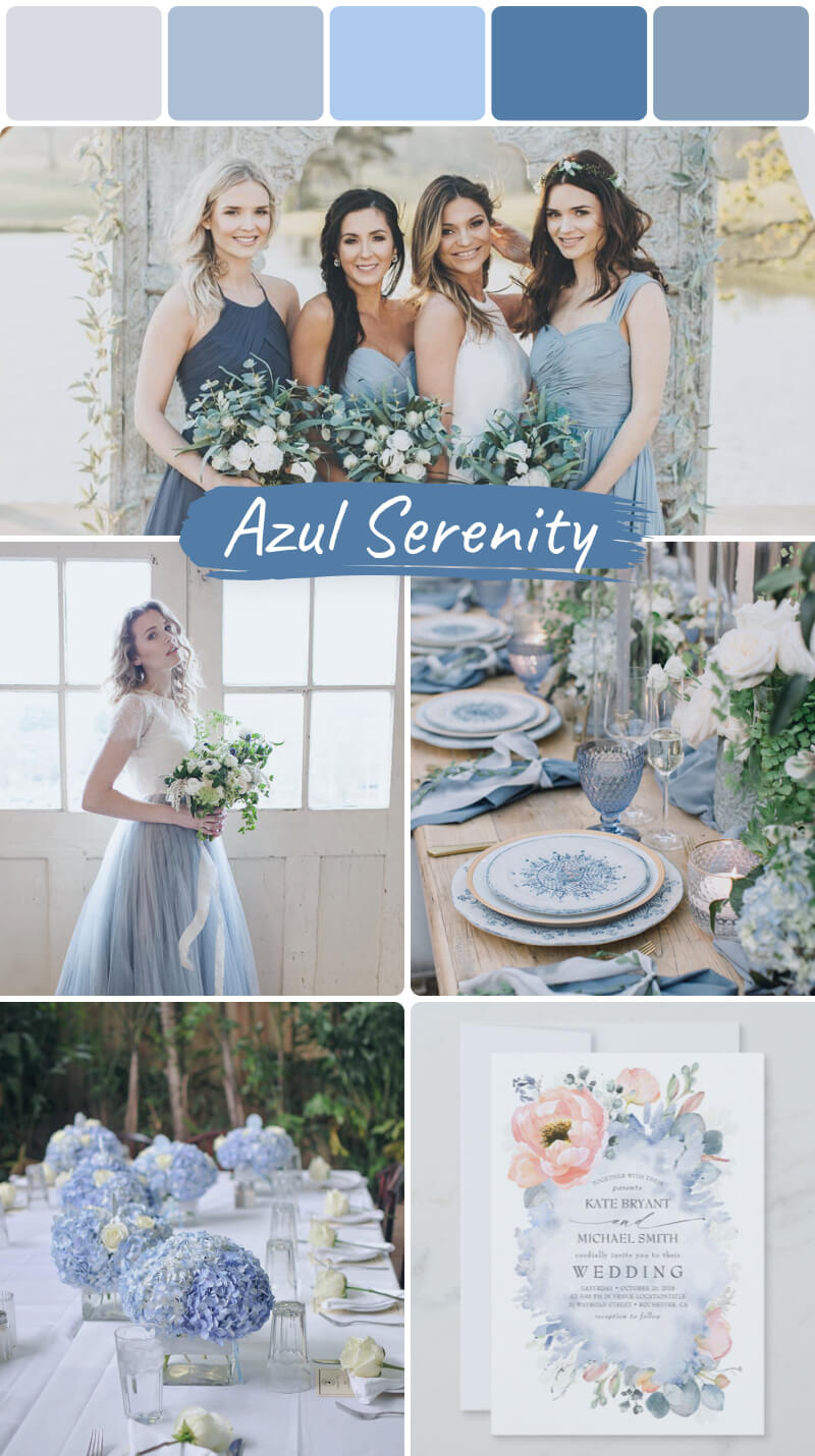 A paleta de cores para casamento azul serenity é suave, mas elegante. Utilize esta cor em casamentos abertos, realizados num sítio ou no campo, por exemplo, já que as cores contrastam bem com verde.