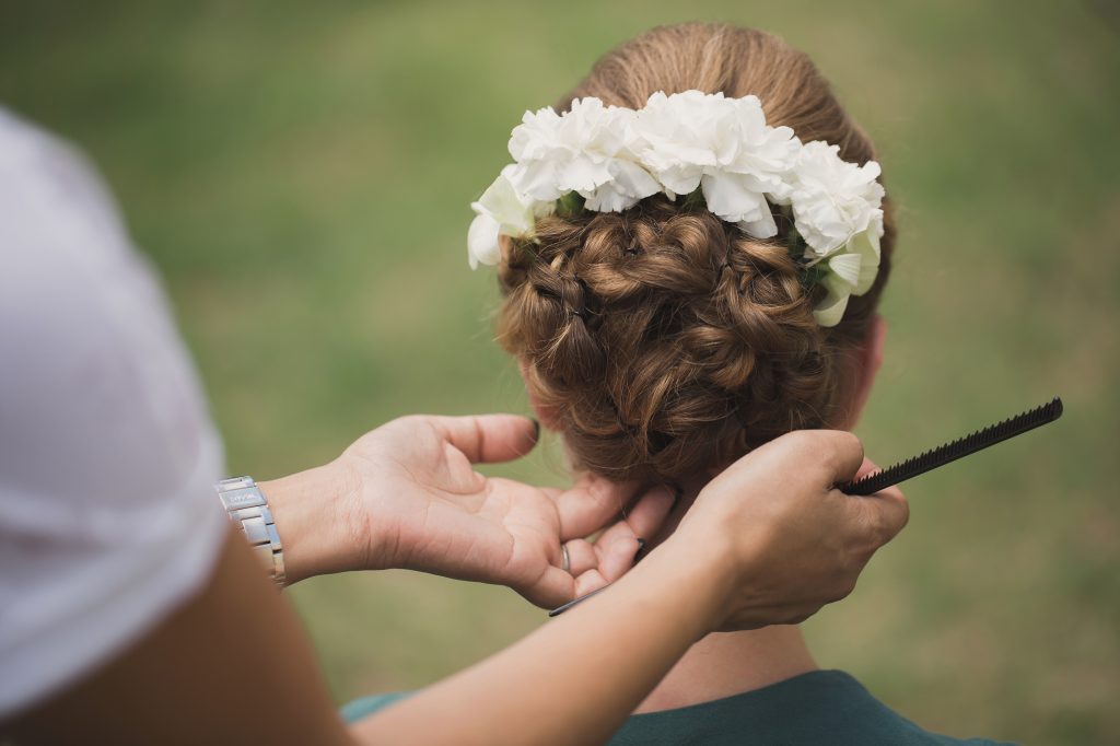 Se a cerimônia for ao ar livre, considere vento e umidade. Portanto, converse sobre sprays de alta fixação, reforço de grampos e horários da cerimônia de casamento. Para o álbum, pense também no enquadramento do penteado nas fotos de casamento.