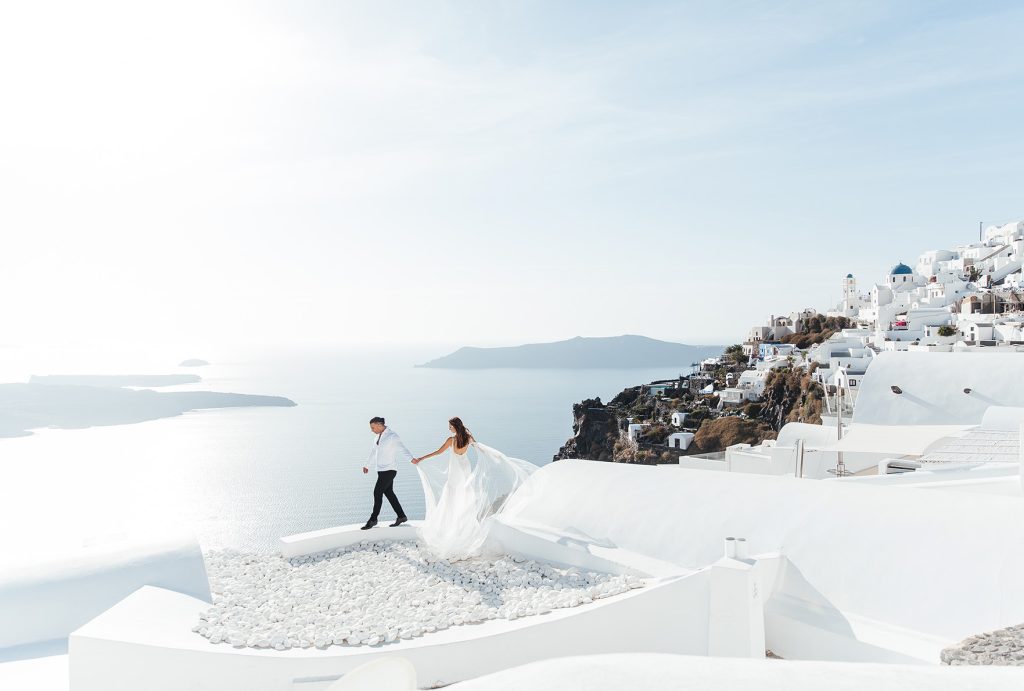 Santorini oferece vistas icônicas. Pacotes para o casal e até quatro convidados sem jantar costumam partir de €3.500. O aluguel do terraço para a cerimônia vai de €330 a €1.100 por 1h30. Com jantar, acrescente de €100 a €150 por pessoa. É possível incluir buquê, celebrante, champagne, flores da mesa, pétalas, tapete, mesa e utensílios. Em recepções maiores, os menus iniciam a partir de €80 por convidado, enquanto o open bar pode começar em €33.