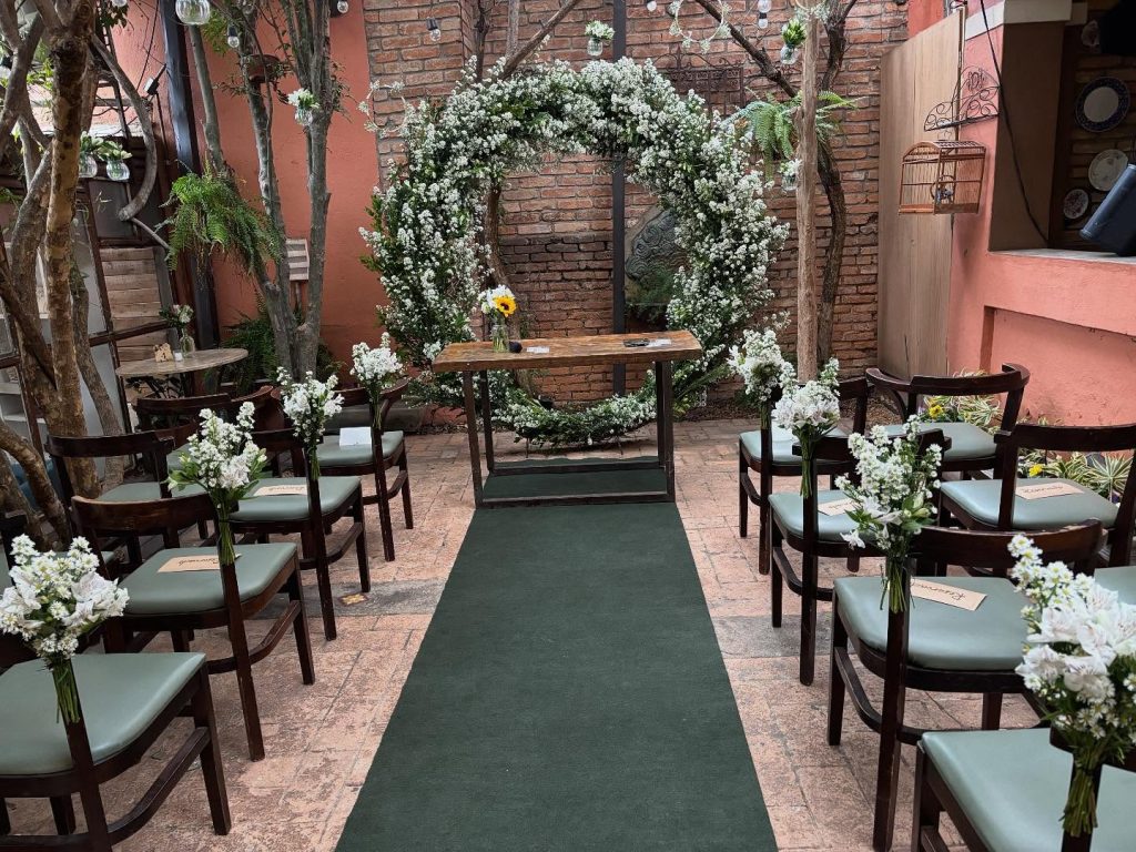 “Queria que todos pudessem ter acesso a um momento lúdico de paz e relax passando por ela e se energizando com o todo amor que coloco todos os dia há 23 anos”, finaliza a empresária. Um bistrô charmoso com ar francês repleto de romantismo para os casais celebrarem a união. O espaço realiza eventos com até 130 pessoas. A cerimônia é realizada em uma viela que foi revitalizada e é cuidada pela espaço há mais de 20 anos.
