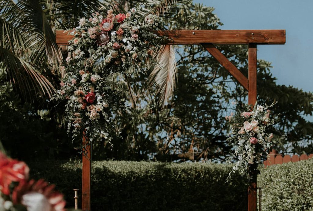 Elementos rústicos: incorporação de móveis vintage, arcos de flores e detalhes artesanais que complementam o cenário natural.