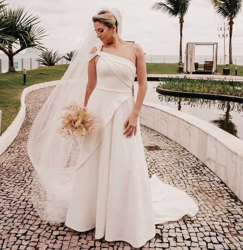 Depois de um período em que as celebrações eram mais intimistas, o estilo minimalista conquistou espaço. Em 2025, ele continua forte, mas ganha novos contornos com bordados criativos, aplicações delicadas e cortes modernos. A proposta é apostar em vestidos lisos que recebem detalhes exclusivos que tornam cada peça única.