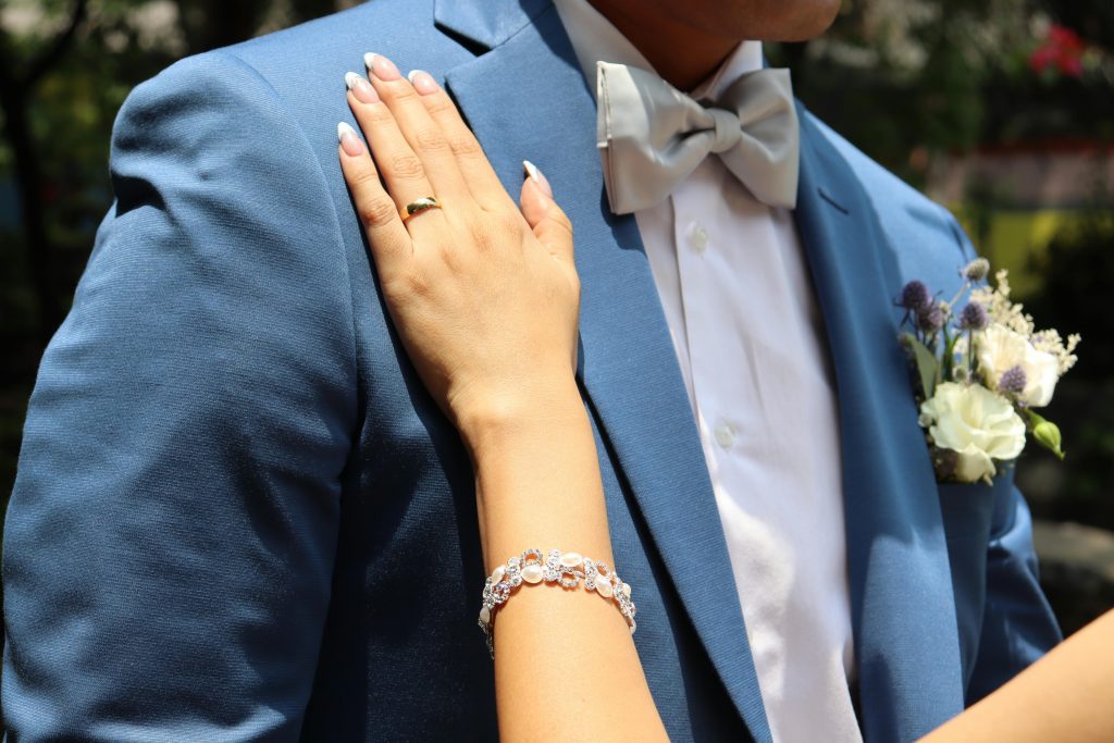 Evite tons idênticos ao do noivo. Logo, contraste é necessário.