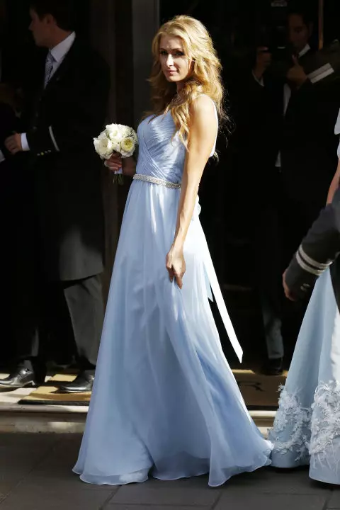 Paris foi uma das madrinhas no casamento da sua irmã, Nicky, em Londres, no dia 10 de julho. Ela estava com um vestido azul bem fluido do estilista Denis Basso.
