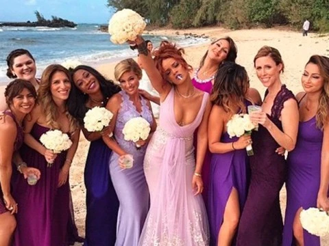 Um casamento no Havaí, com Rihanna como uma das madrinhas. Esse foi o Grande Dia da assistente da cantora, Jennifer Morales, no dia 20 de abril. Rihanna usou um modelo lilás com decote em V.