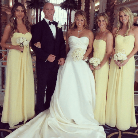 Jennifer foi uma das madrinhas do casamento do seu irmão Blaine no começo do ano. Ela estava com um vestido nude tomara que caia combinando com as outras madrinhas.