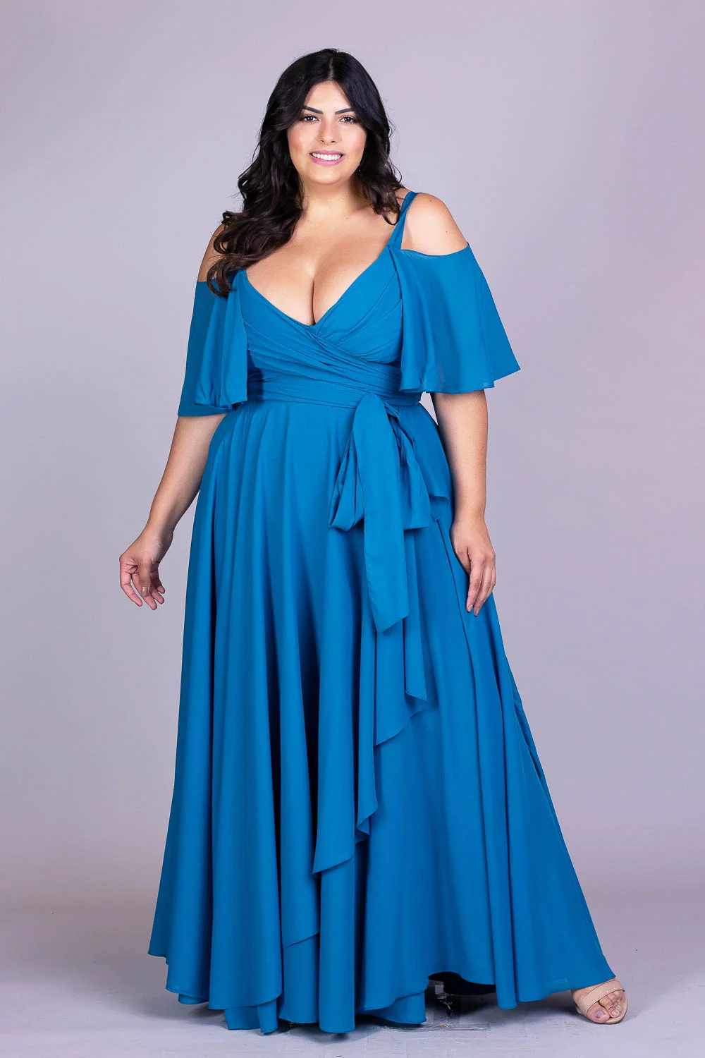 Ambos funcionam — tudo depende do tecido e do caimento. Portanto, vestidos ajustados com elastano, drapeados ou recortes estratégicos podem valorizar muito as curvas. Já os mais soltinhos, como os em chiffon ou tule, oferecem leveza e elegância.