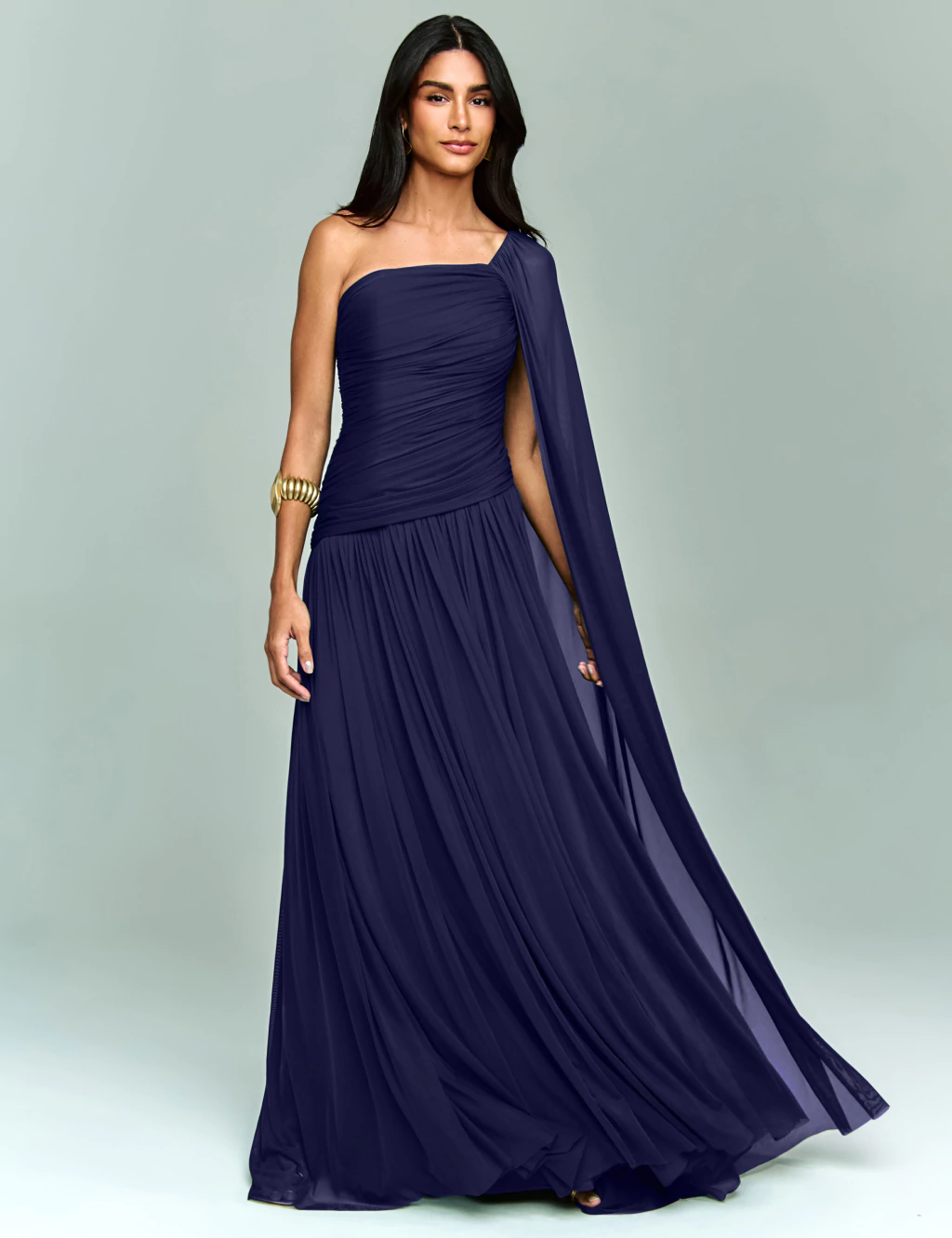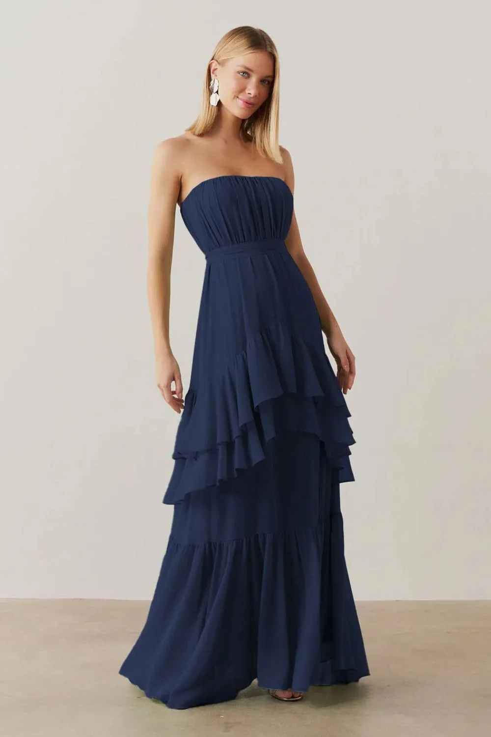 O vestido de madrinha azul-marinho em chiffon é uma escolha versátil que une elegância e conforto. Além disso, seu caimento leve proporciona movimento natural, conferindo leveza ao look.