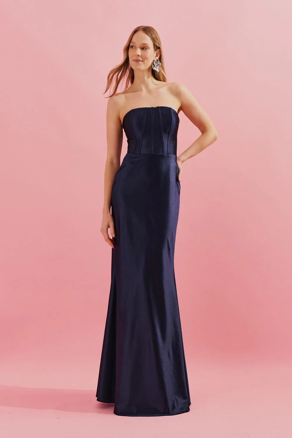 O slip dress azul-marinho é uma escolha moderna e sofisticada, perfeita para madrinhas que buscam elegância com simplicidade.