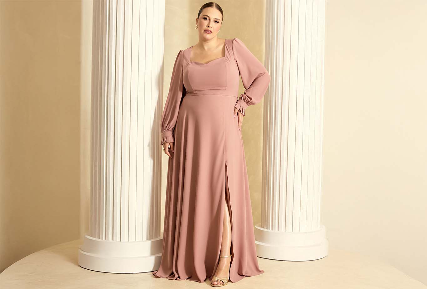 O vestido rosé para madrinha plus size é uma escolha elegante e acolhedora, pois a cor rosé transmite sofisticação sem perder leveza. Ao escolher o modelo, prefira cortes que valorizem a silhueta com caimento fluido e definição na cintura, como evasê, império ou modelos com cintura marcada — eles ajudam a equilibrar proporções e criar uma linha mais alongada.