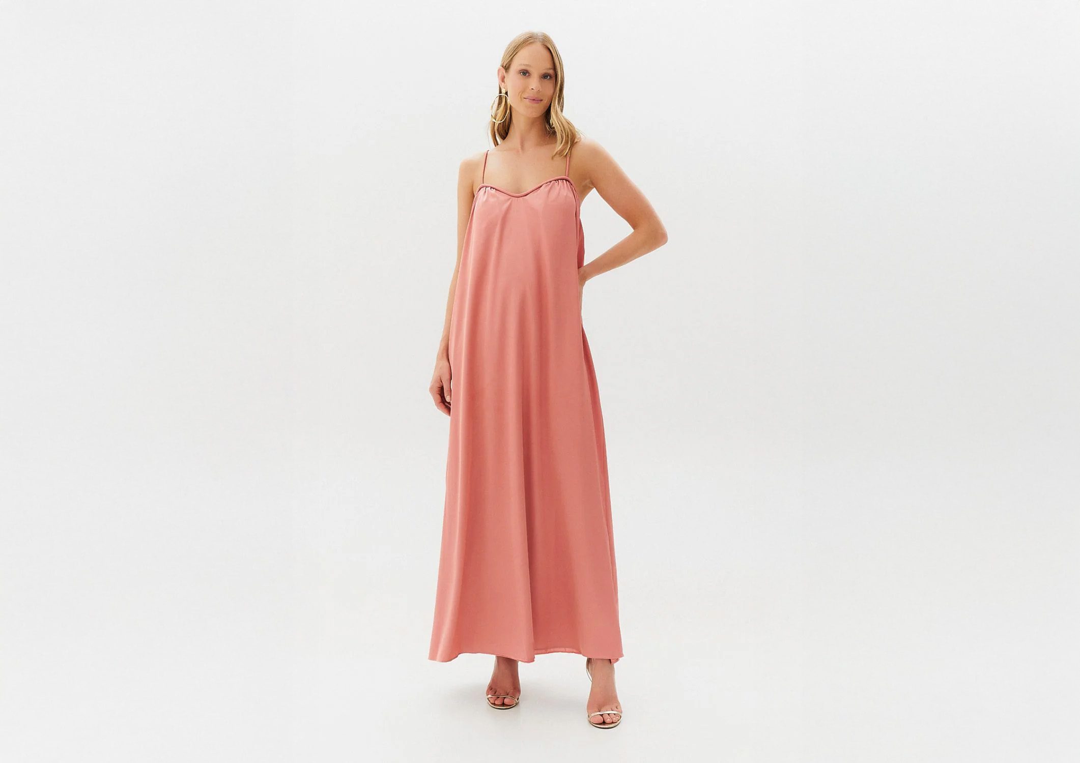 Ao mesmo tempo, ele equilibra conforto e sofisticação, oferecendo mobilidade e leveza sem perder a formalidade necessária ao papel de madrinha. Para usar, combine com acessórios delicados — como sandálias finas e joias discretas — e pense em penteados que valorizem o decote ou o caimento do vestido. Assim, o rosé midi se torna uma escolha charmosa, feminina e adequada ao clima da celebração.