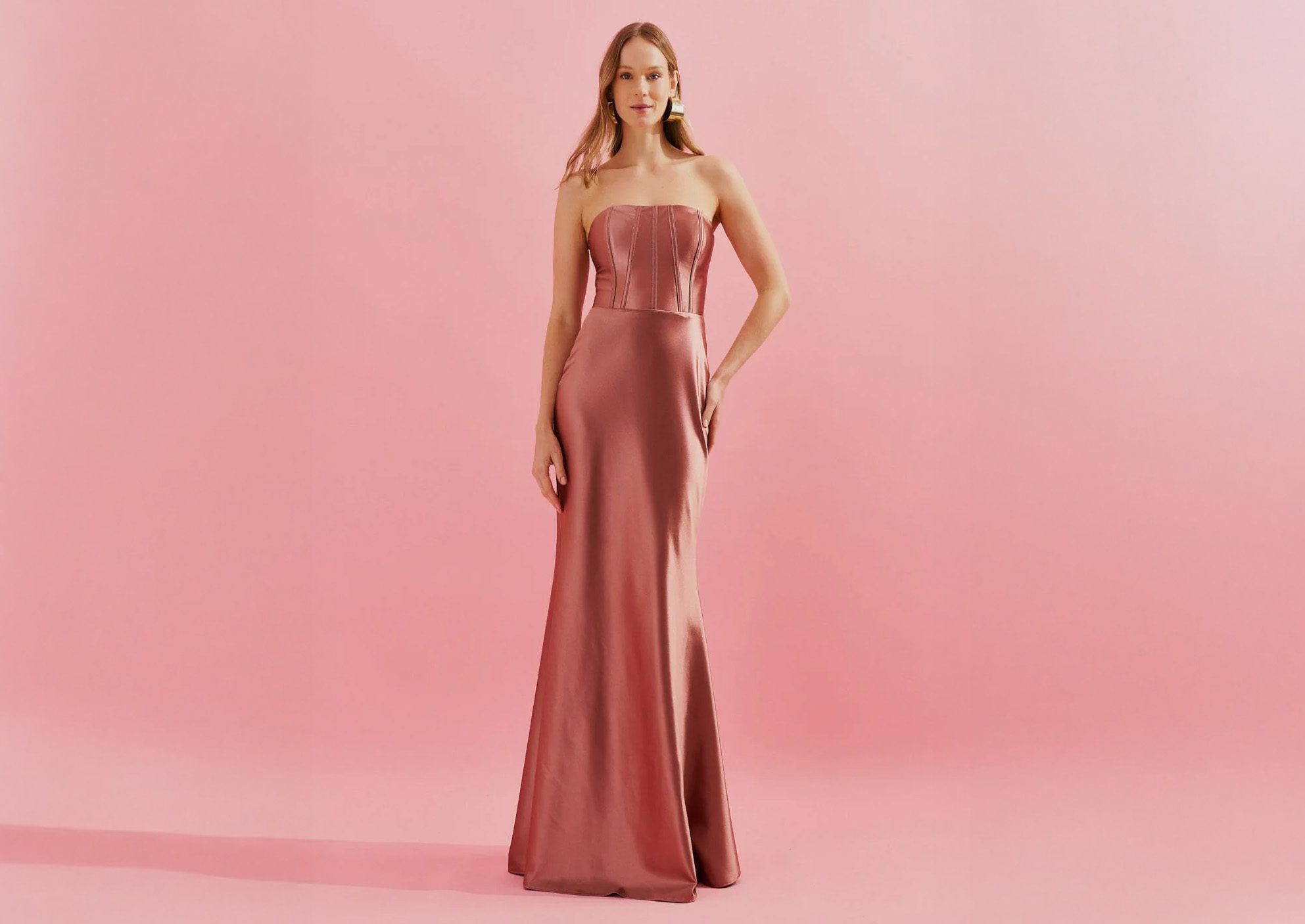 O vestido rosé para madrinha deve seguir, acima de tudo, a formalidade do casamento: em cerimônias tradicionais ou noturnas, o comprimento longo é a escolha mais adequada e segura. Já em eventos diurnos ou mais informais, o midi pode ser considerado, desde que esteja alinhado à orientação da noiva. Além disso, é importante observar a proporção e o caimento para garantir elegância e conforto.